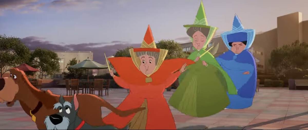 We see the fairies from Sleeping Beauty arguing over the color of the landmark hat on the building outside, but they’re also joined by Jock and Trusty from Lady and the Tramp.