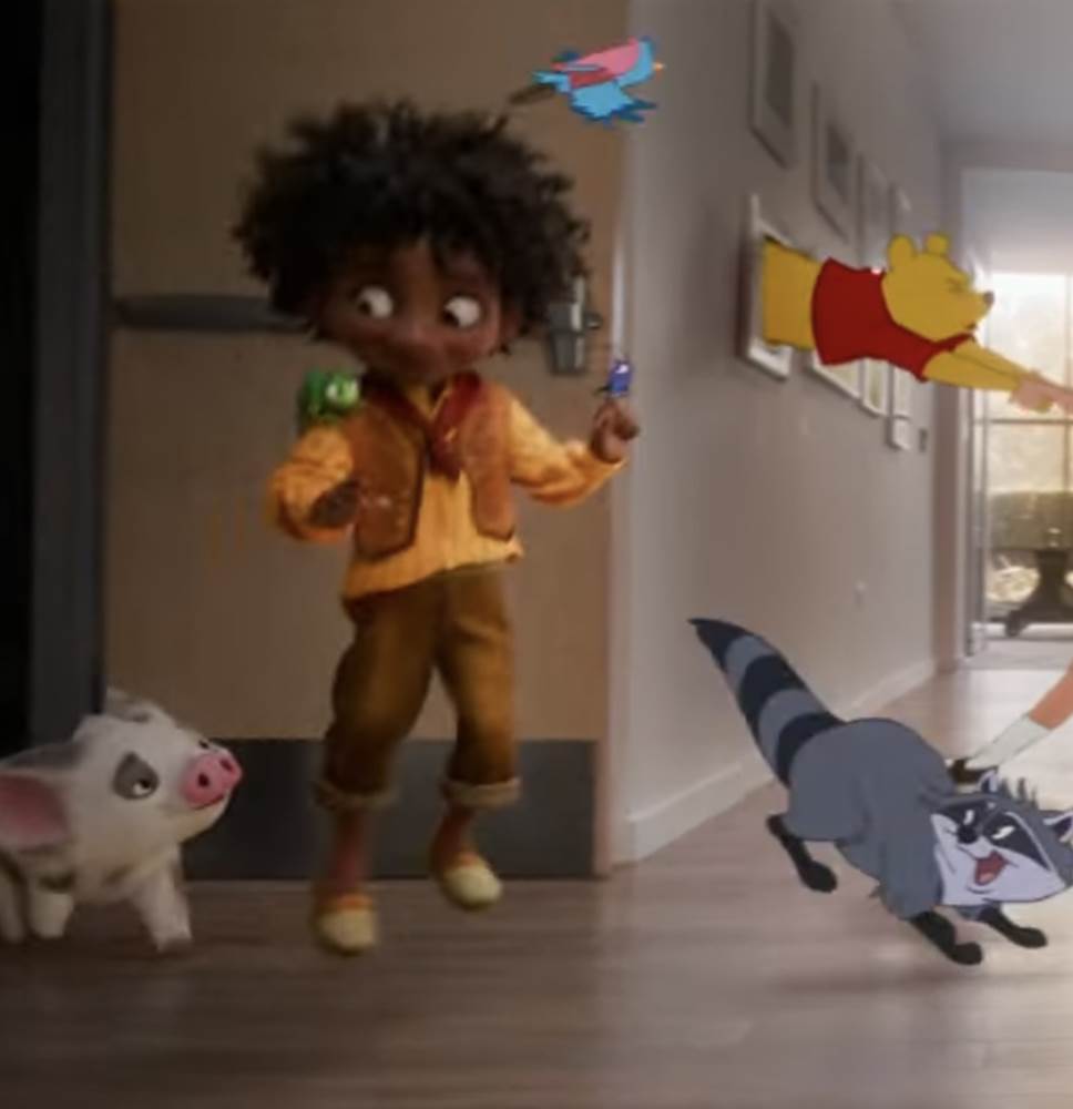 And while we see Winnie the Pooh and his friends struggling a la Winnie the Pooh and the Honey Tree, we see Antonio from Encanto running down the hall surrounded by his animal friends. Oh wait, those aren’t his animal friends. That’s Pua from Moana, Pascal from Tangled, Meeko from Pocahontas, Cri-Kee from Mulan, and some dressmaking bluebirds from Cinderella.