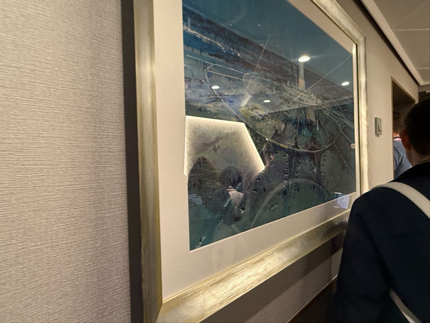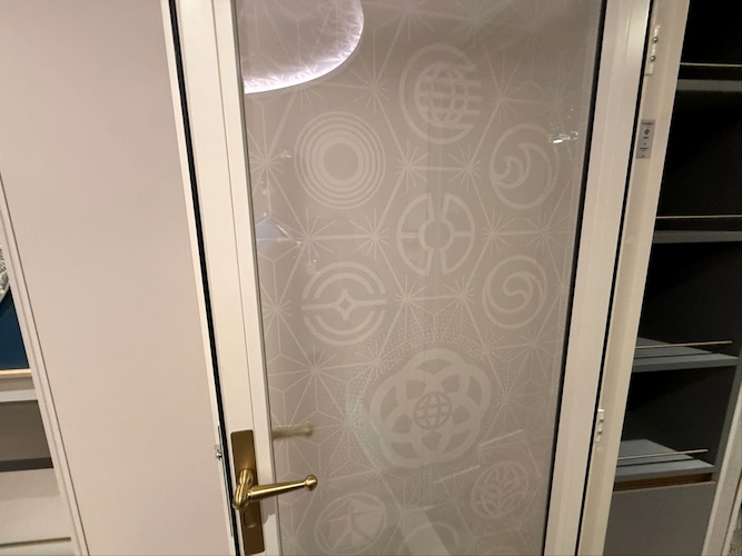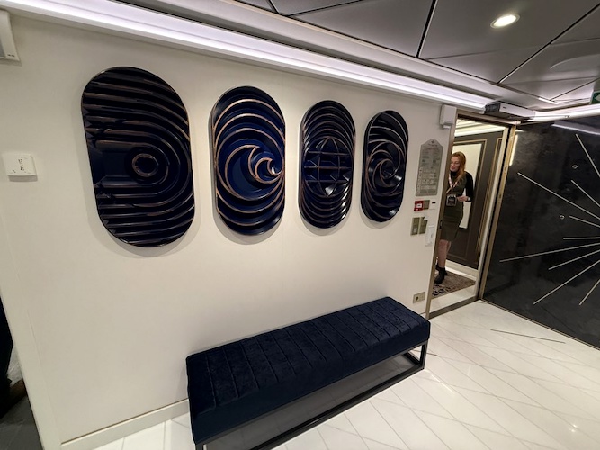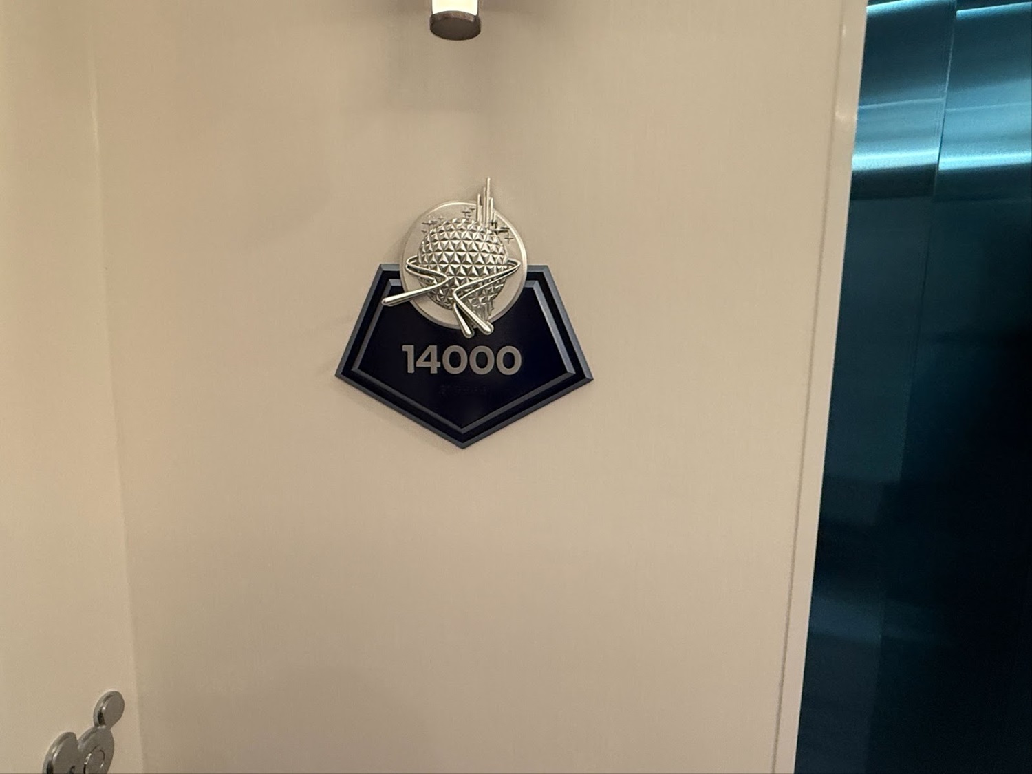 Guests booking a trip aboard the Disney Treasure can experience the spirit of EPCOT in the new luxurious Tomorrow Tower Suite. At nearly 2,000 square feet, the concierge level penthouse features its own private elevator, an expansive two story window with views of the ocean, 2 main bedrooms with walk-in closets, a library/bedroom, a children's room, and four and half bathrooms. Heading to the private elevator, guests will find classic EPCOT artwork and a Spaceship Earth inspired Room Number plaque.