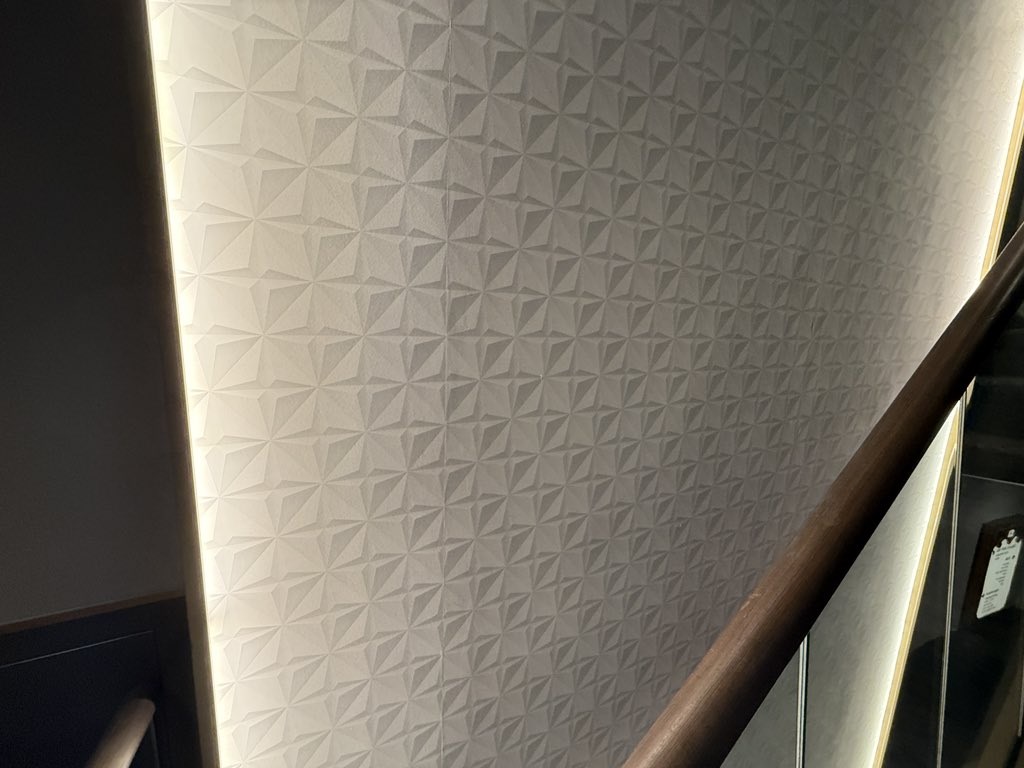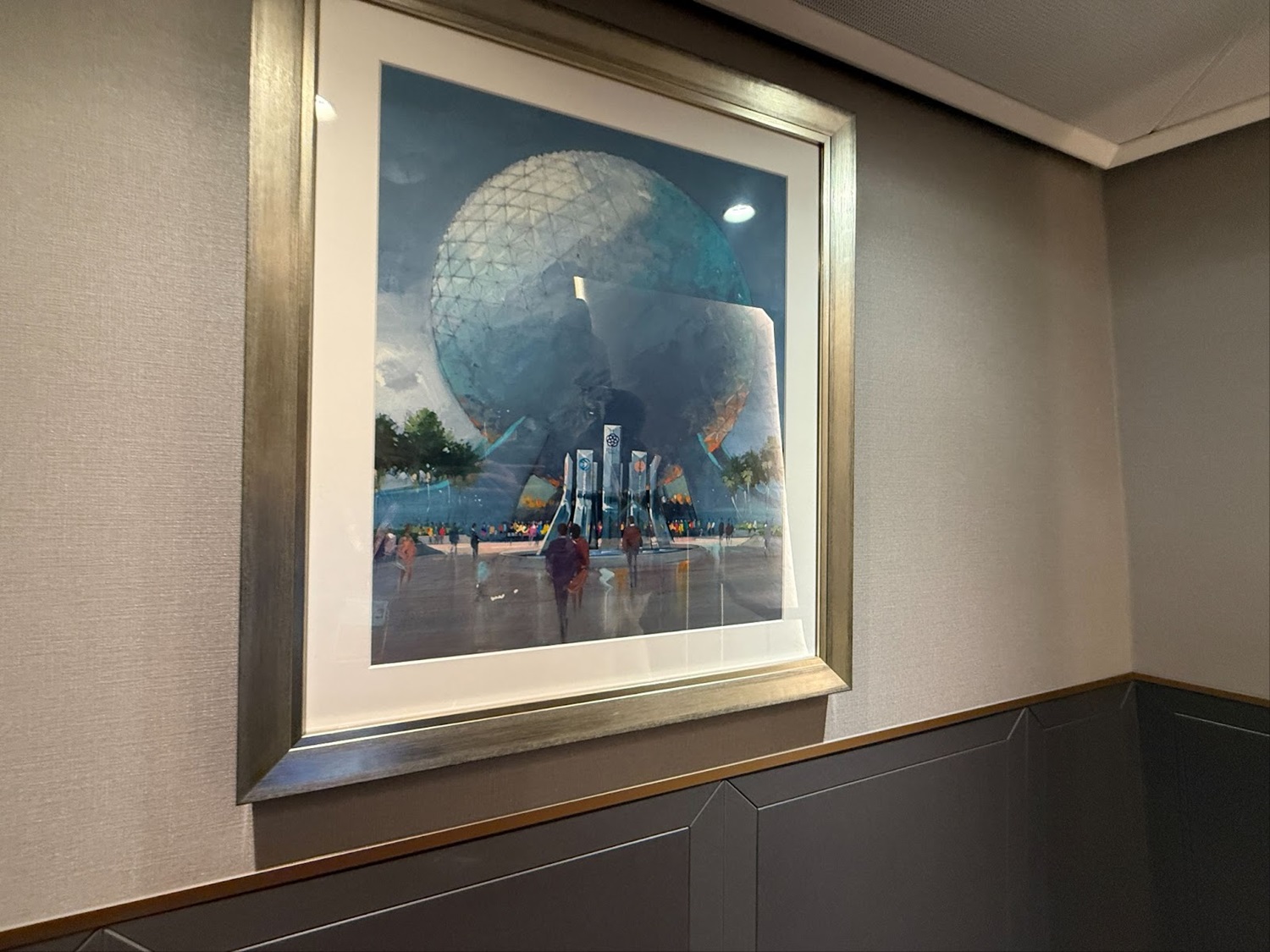 Upon heading up the elevator, guests are welcomed into the two-story suite with lighting and art inspired by the Walt Disney World theme park. Four statement pieces featuring the logos for World of Motion, The Living Seas, Spaceship Earth, and the Imagination Pavilion adorned the main entryway.