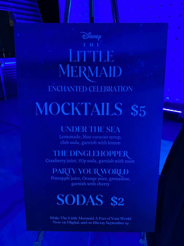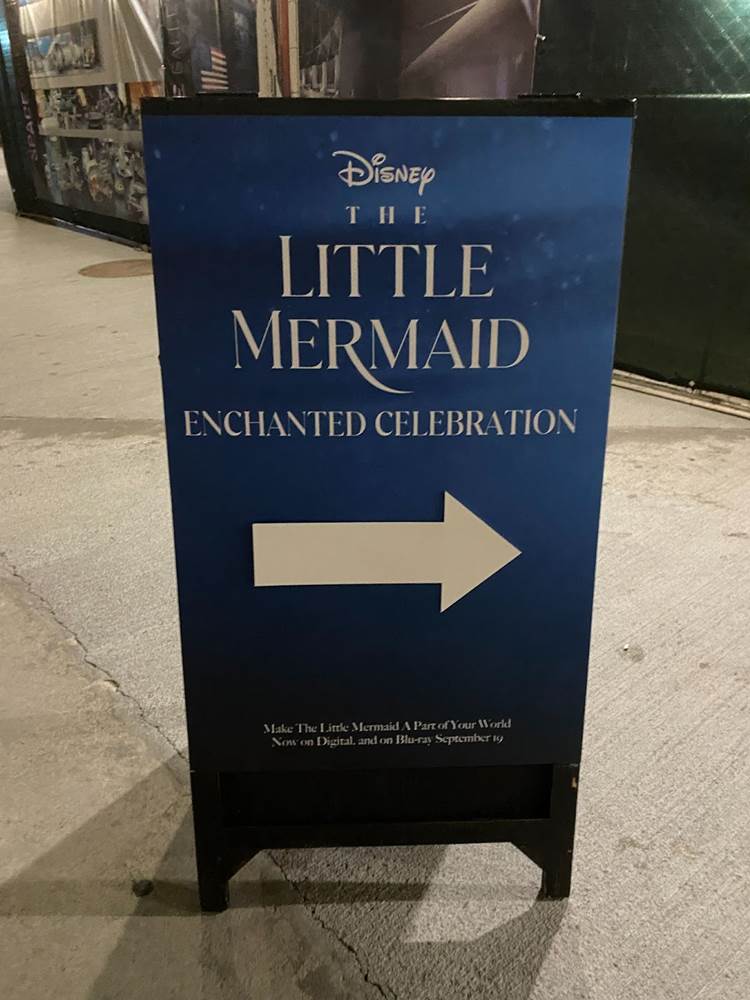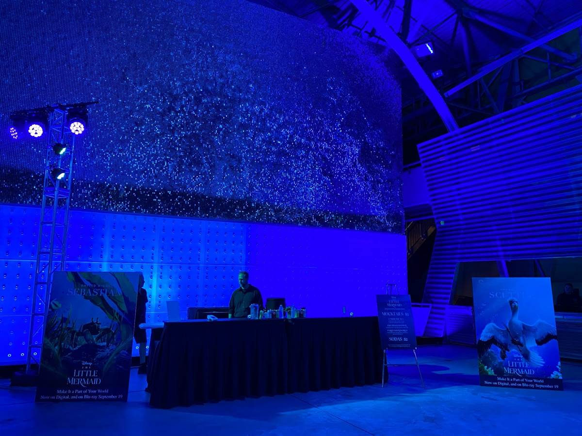 The Little Mermaid Enchanted Celebration began at 8:00 PM Friday evening at the Science Center’s event space, with fans lining up down the sidewalk for admission. Outside the entrance were some cool lighting effects and posters featuring characters from the movie.