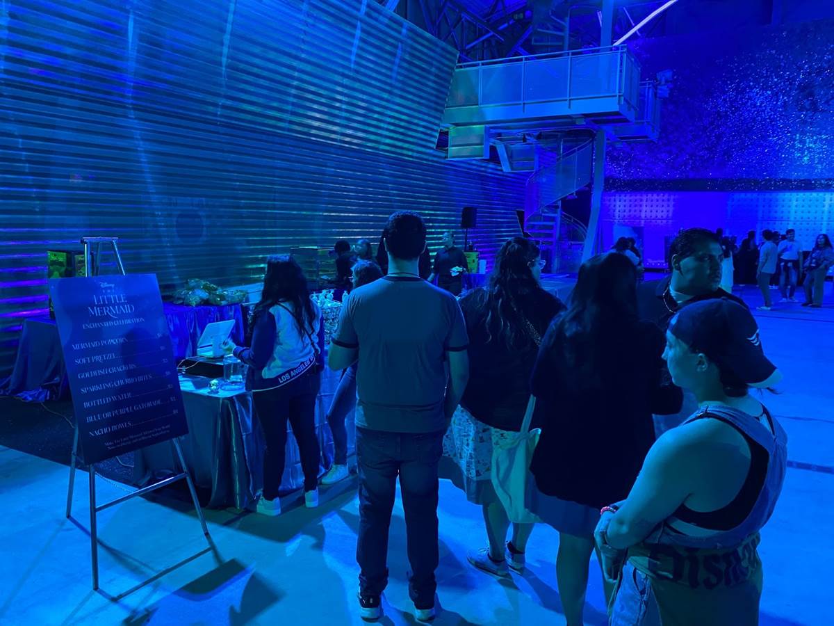 The Little Mermaid Enchanted Celebration began at 8:00 PM Friday evening at the Science Center’s event space, with fans lining up down the sidewalk for admission. Outside the entrance were some cool lighting effects and posters featuring characters from the movie.