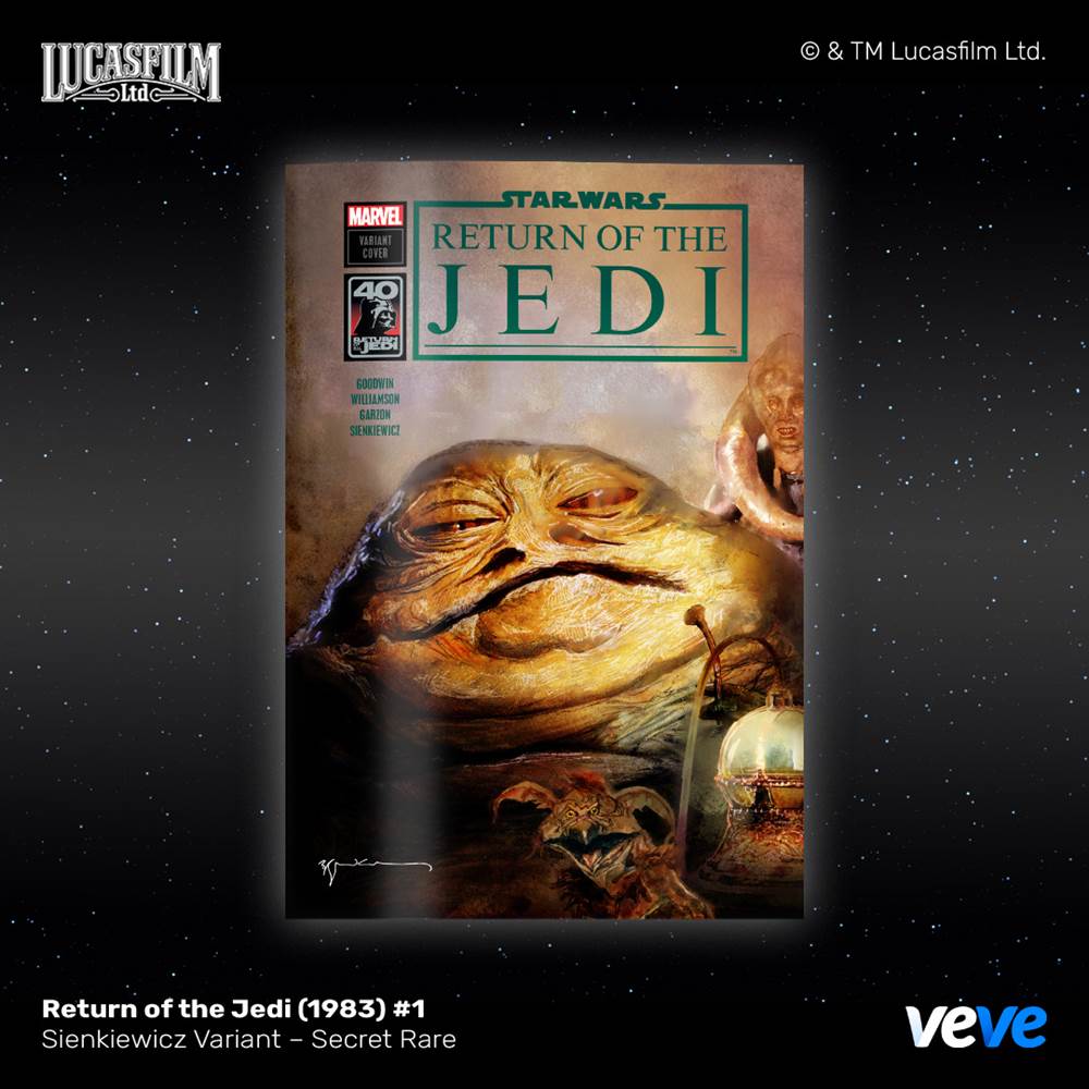 - Bill Sienkiewicz Variant: Bill Sienkiewicz created this never-before-seen art for the 40th anniversary of Return of the Jedi #1. As the original artist of the 1983 comic cover, featuring Luke Skywalker, Lando Calrissian and Princess Leia, his anniversary version features another classic trio. Jabba the Hutt takes center stage while his majordomo, Bib Fortuna, and jester, Salacious B. Crumb, are edged out of the composition.