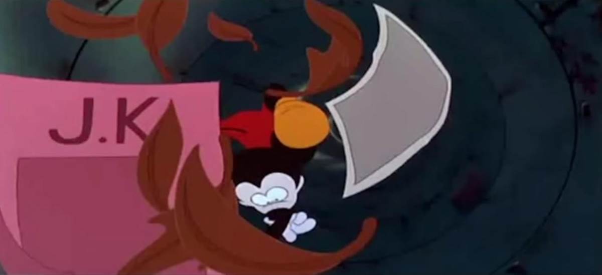 That said, they snuck a reference to this departure in the short, as Mickey is sucked into a trap door outside the laboratory, for what the duo said must only be three frames. In that literal blip, one can see a pink slip emblazoned with the letters J.K., as the full name must have been too difficult (or too obvious) to animate for those few frames.