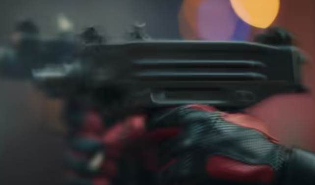 A quick shot shows Deadpool’s hands wielding twin automatic weapons. The only thing is, those aren’t Deadpool’s hands. That earlier sequence of Wade suiting up, showed him wearing clearly different gloves from the ones seen in the image above.