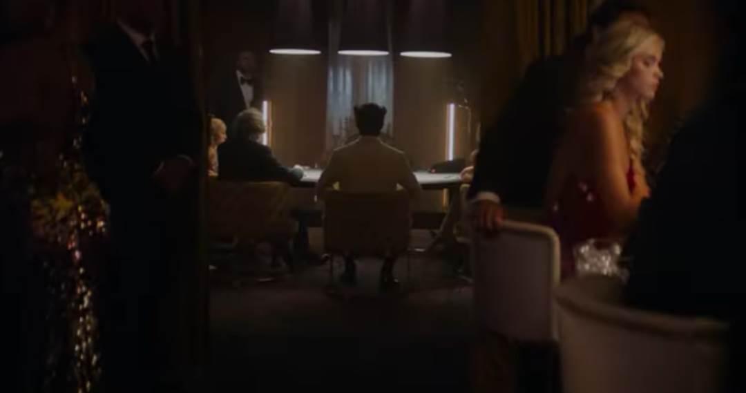 We then see Wade, now in full Deadpool costume, making his way through a casino. He approaches a table at which we see what appears to be Wolverine in a white suit with his back to us.