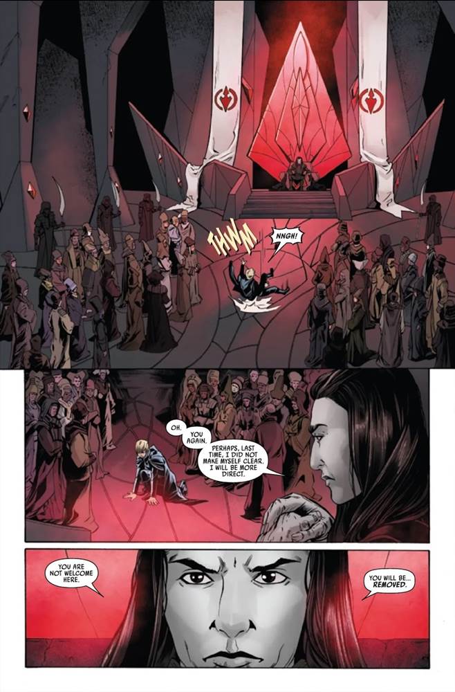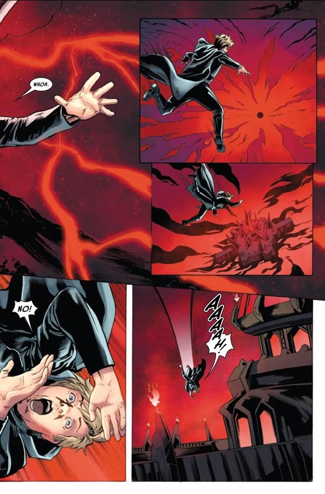 There’s some back-and-forth here between these three characters, and we get some intriguing new details about the mythology behind the Jedi, but eventually Luke gets the opportunity to re-enter the red Kyber crystal and attempt once again to free it from the power of the dark side. He finds himself in a vision of the throne room of a Sith being surrounded by underlings, who proceed to throw him in a prison cell. This Sith tells Luke the story of what happened to the last Jedi who dared intrude on her dark deeds, while back in reality Gretta and Feez discuss whether they’ll be able to sense when Luke is in trouble– not to mention the possibilities of retrieving him from the vision if that happens.
