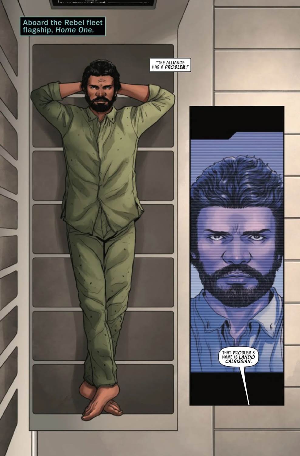 Star Wars #44 begins where a previous story arc had left off: with Lando Calrissian being held in the custody of the Rebel Alliance for treason, among other crimes. Princess Leia Organa and Mon Mothma (via hologram) meet covertly with Admiral Ackbar and General Crix Madine aboard the Mon Calamari vessel Home One to discuss Lando’s fate, with the latter two simply wanting to unceremoniously throw him out an airlock. But Mon and Leia naturally take a more diplomatic approach, proposing that Calrissian be put on trial for his misdeeds. Then Lobot– who Lando was acting to save when he sold valuable Rebellion information to Jabba the Hutt– has a heart-to-heart with his friend, ultimately suggesting that Calrissian hire an advocate to represent him in the secret court. Enter Salli Georgio, a smooth-talking lawyer who we first met in last December’s Star Wars: Revelations one-shot. By the way, I find it somewhat curious that artist Madibek Musabekov is drawing Lando here as sort of a mashup between the faces of Billy Dee Willians and Donald Glover, and I wonder if that has something to do with the latter’s renewed interest in reprising his role as the young Calrissian in an upcoming film.