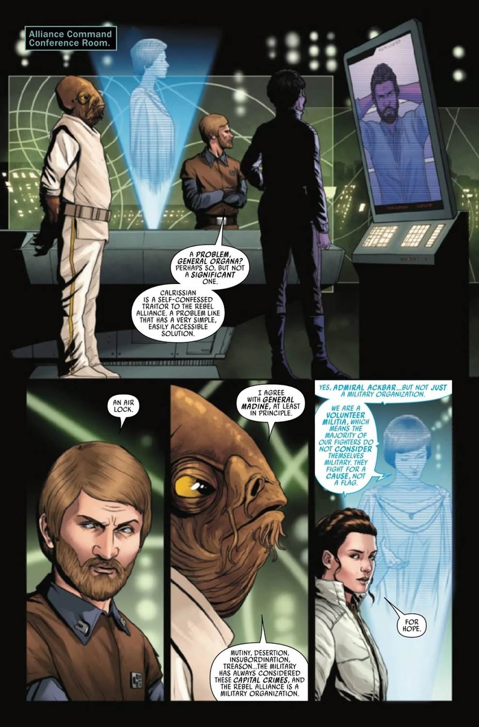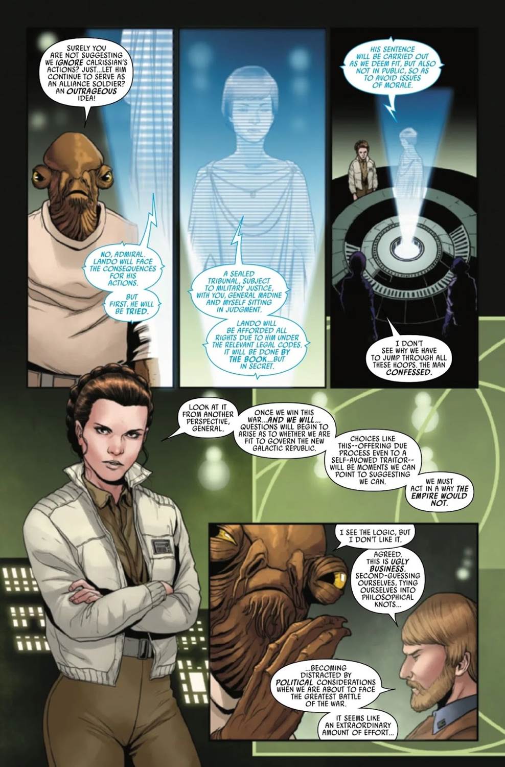 Meanwhile on the “pretty fancy" (in Lando’s words) world of Uveron, where Mon Mothma has traveled on a fundraising mission for the Alliance, an unnamed group of assailants glide into action using winged suits, though we won’t discover their target until later in the comic (it’s fairly easy to guess who they’re after). Back on Home One, Salli Georgio arrives after being transported by Chewbacca and is welcomed by Leia and Luke Skywalker. Declining to meet with her client, Georgio instead opts to refresh in her room, and the trial begins the next day. She makes several attempts to delay the proceedings, but Madine shuts them down and the prosecutor Captain Darrien Muskray (newly introduced here) begins his rather convincing arguments. His chief witness is the Talky droid that Lando stole from rebel storage and dumped into Jabba’s possession along with his indispensable Trawak code data.