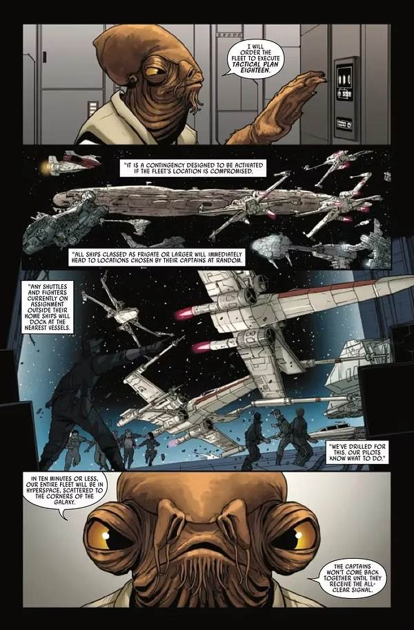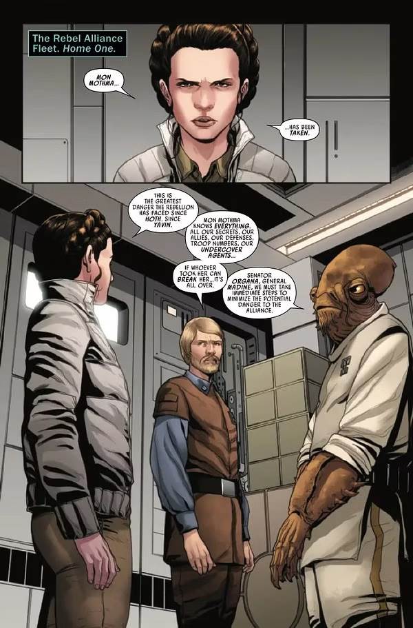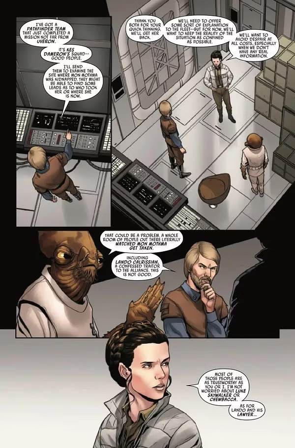 Star Wars (2020) #45 begins where the previous issue left off, with Senator Mon Mothma having been kidnapped during a diplomatic mission by unknown assailants, right in the middle of her participation (via hologram) in the trial of Lando Calrissian for crimes of treason against the Rebel Alliance. Thankfully for the safety of the rebellion, Admiral Ackbar has a plan that he immediately sets into motion, sending all of the fleet’s ships to different, randomly chosen locations across the galaxy– just in case Mothma’s captors are able to coerce information out of her. Meanwhile, General Crix Madine sends in a Pathfinder team led by Kes Dameron to investigate the kidnapping on the planet Uveron, where they find a holographic message asking for a steep ransom in exchange for the senator’s safe return– otherwise her abductors will turn her over to her villainous enemies in the Galactic Empire.