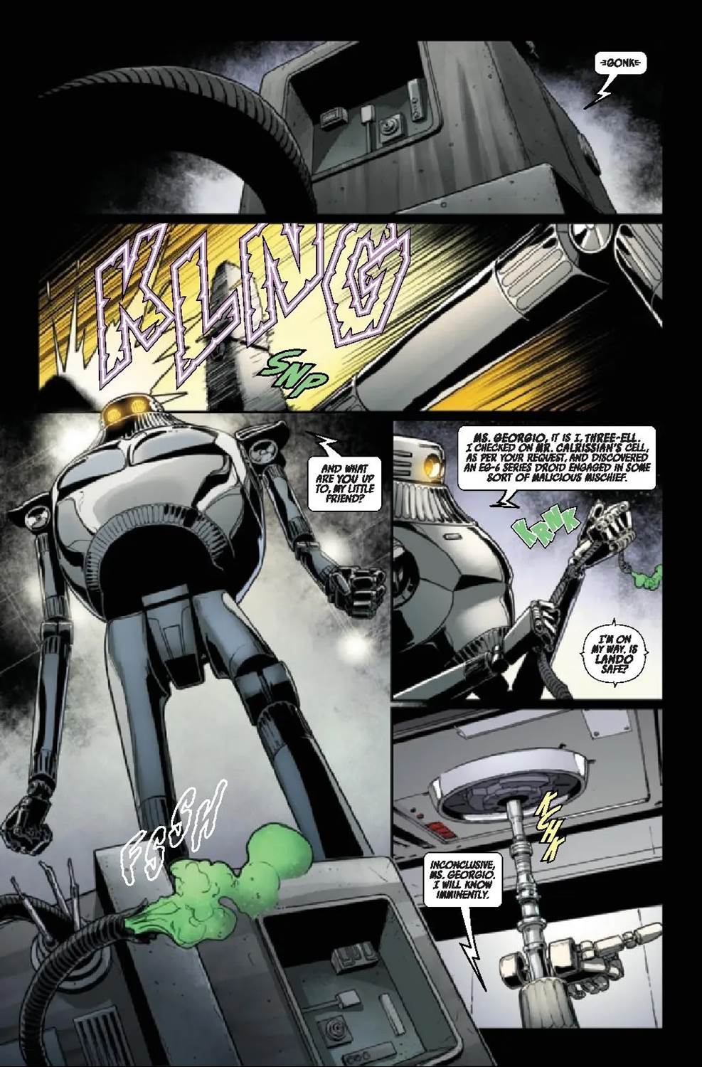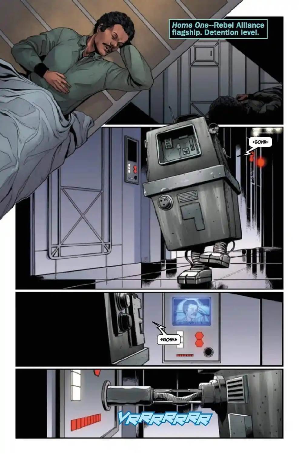 Lando tells Leia that he now has valuable information about the layout of Jabba’s palace and where exactly Han’s carbonite-frozen body is being displayed. He offers the Alliance those details if they promise to let Lobot off scott-free, and then proceeds to take the stand and gives one of the best, most accurately Lando-esque speeches in writer Charles Soule’s (who has always been good at writing Lando) run on Star Wars. Then there are closing statements and deliberations, and even an implication on just how exactly Lando becomes a General in the Rebel Alliance (now I’m wondering if the Battle of Taanab was ever even a real thing, or just a smokescreen), followed by the assembled rebel leaders beginning their deliberations. Considering all the evidence and testimony, Mothma, Admiral Ackbar, and Crix Madine find Calrissian guilty of the charges levied against him, but instead of executing him by throwing him out of an airlock as he has predicted multiple times, instead they fine him 250 million credits. And they even give him the opportunity to work that money off by continuing to serve the rebellion.