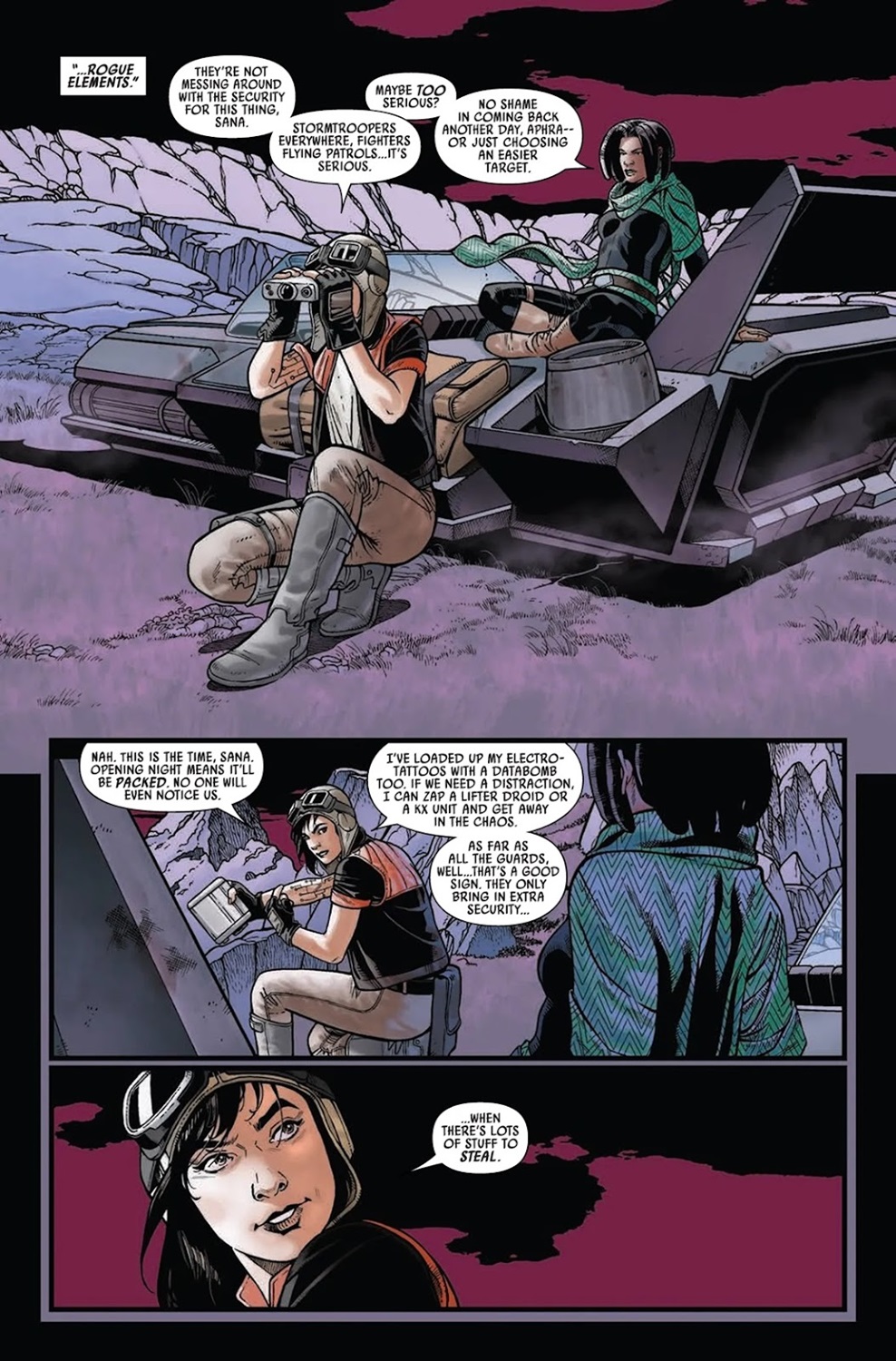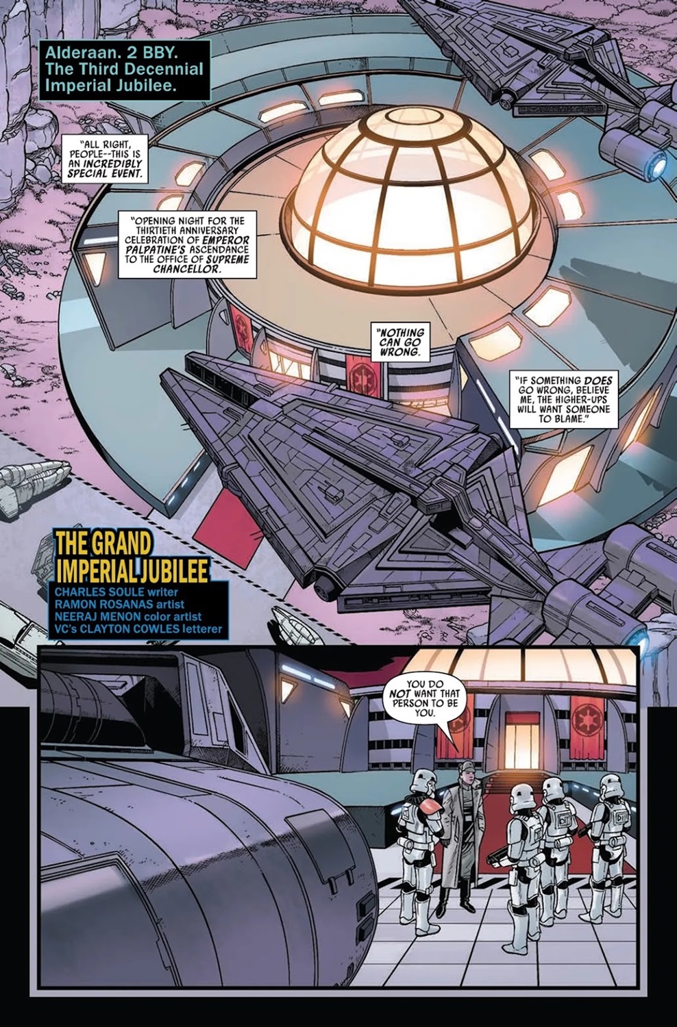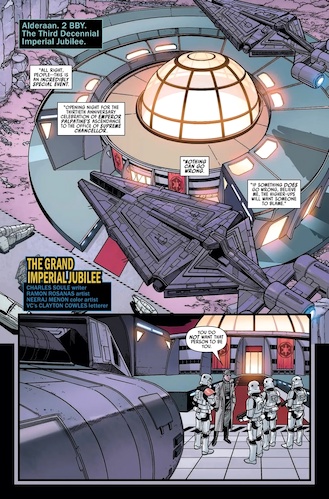 A New Legacy is made up of three separate stories, the first of which stars rogue archaeologist Dr. Chelli Lona Aphra and her on-again/off-again girlfriend and partner-in-crime Sana Starros. It’s set two years prior to the events of the original Star Wars film, which I believe makes it the chronologically earliest Aphra tale to be published so far. Here writer Charles Soule (of the upcoming Star Wars: Legacy of Vader series) and artist Ramon Rosanas (Star Wars: Age of Resistance) bring us to the “Third Decennial Imperial Jubilee" on Alderaan, in commemoration of three decades since Emperor Sheev Palpatine became Supreme Chancellor of the Galactic Republic (in the 1999 film Star Wars: Episode I - The Phantom Menace). Apparently Chelli and Sana have been hired to steal a statue from the event’s art exhibition and replace it with a holographic replica, and knowing how these two operate it feels unlikely from the start that this plan is going to work out well. Complicating matters is the fact that Aphra is being hunted by Beilert Valance (who originated in the 1970s Marvel Comics Star Wars title) and his partner Rik Duel (another carry-over from the old comics).