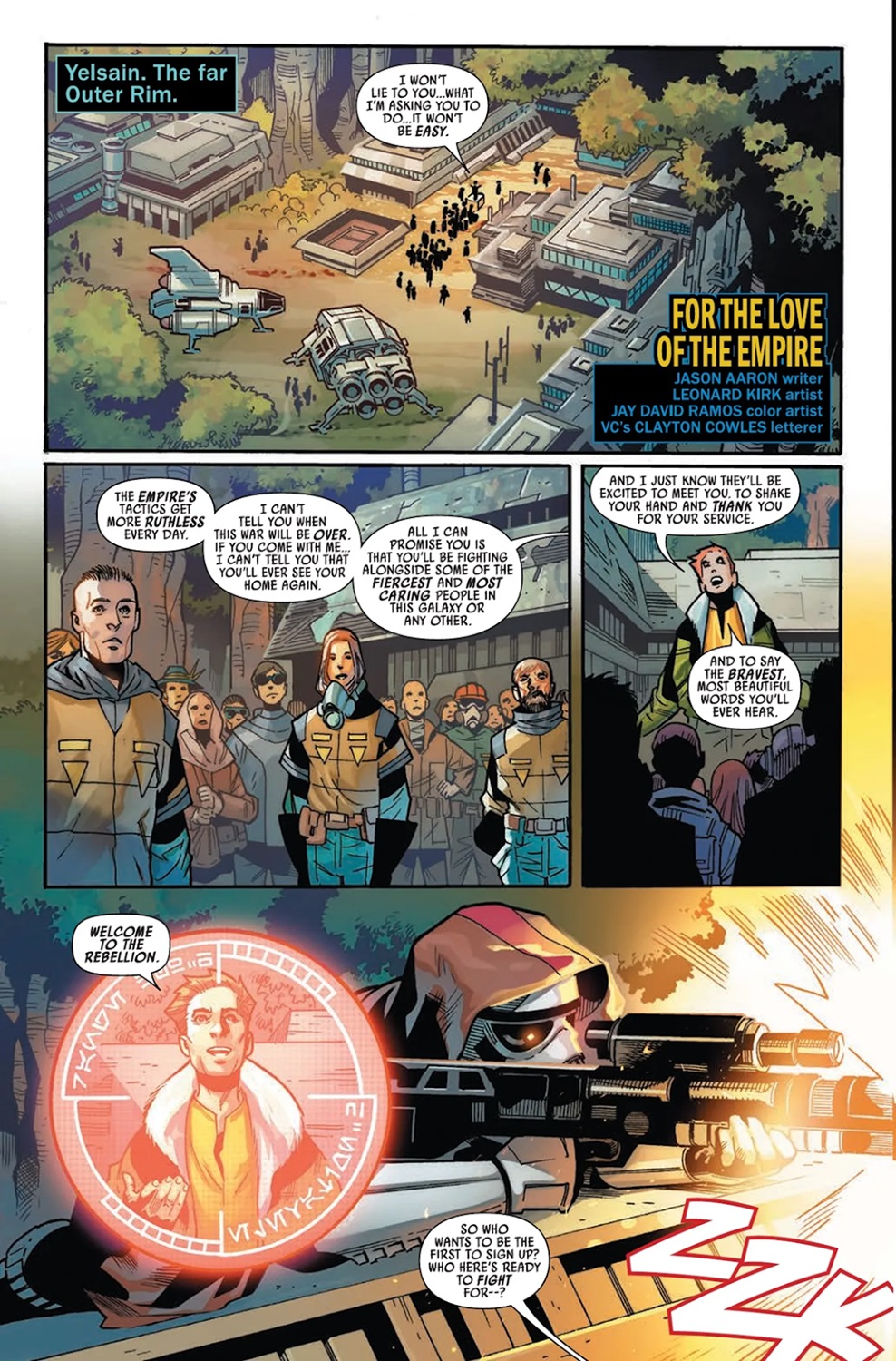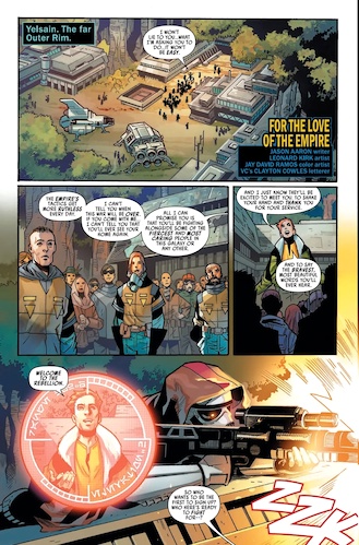 The next story sees writer Jason Aaron (who penned the 2015 Star Wars reboot for Marvel Comics) revives a group of characters that he created– namely the Scar Squadron of elite Imperial stormtroopers and its lightsaber-wielding leader Sergeant Kreel. This is where I put together the pieces that Task Force 99, which is Scar Squadron’s official designation, was named after Clone Force 99, AKA The Bad Batch. But where that latter group broke free of its allegiance to the Empire, Scar Squadron runs rampant over the galaxy, hunting down and executing anyone affiliated with the Rebel Alliance. This tale is a fascinating character study of Kreel and his men as they find themselves in a changed galaxy after the Battle of Yavin and the destruction of the first Death Star. I particularly enjoyed the moment when they find a group of kids play-acting as Luke Skywalker and his friends on the planet Horford, and artist Leonard Kirk (Star Wars: Han Solo - Imperial Cadet) has a suitably kinetic style to his drawing that really brings these characters to life on the page.