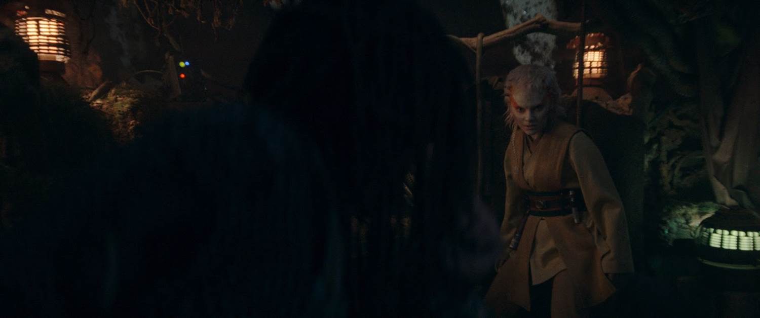 As Mae attempts to sneak out of the hut she is ambushed by Jecki Lon (Dafne Keen), and the two fight hand-to-hand– not to mention Force-to-Force– as the former attempts to arrest the latter for the recent murders of the Jedi Masters. But Jecki and Mae appear to be fairly evenly matched, much like the Master and Sol, who tries to get his foe to remove his helmet and reveal his identity. But the Master doesn’t want to have his thoughts read– apparently his helmet prevents that like Magneto’s in X-Men?-- and both battles continue. Yord tells Osha about how the Master had the ability to get into his head, and Osha says that her mother was once able to do that with another Jedi. Jecki finally manages to overpower Mae and get binders onto her wrists, grabbing Kelnacca’s saber in the process and chastising Mae for stealing it. Then Jecki fights the Master with both lightsabers as the dark-sider tells Mae she could learn something from the Padawan.
