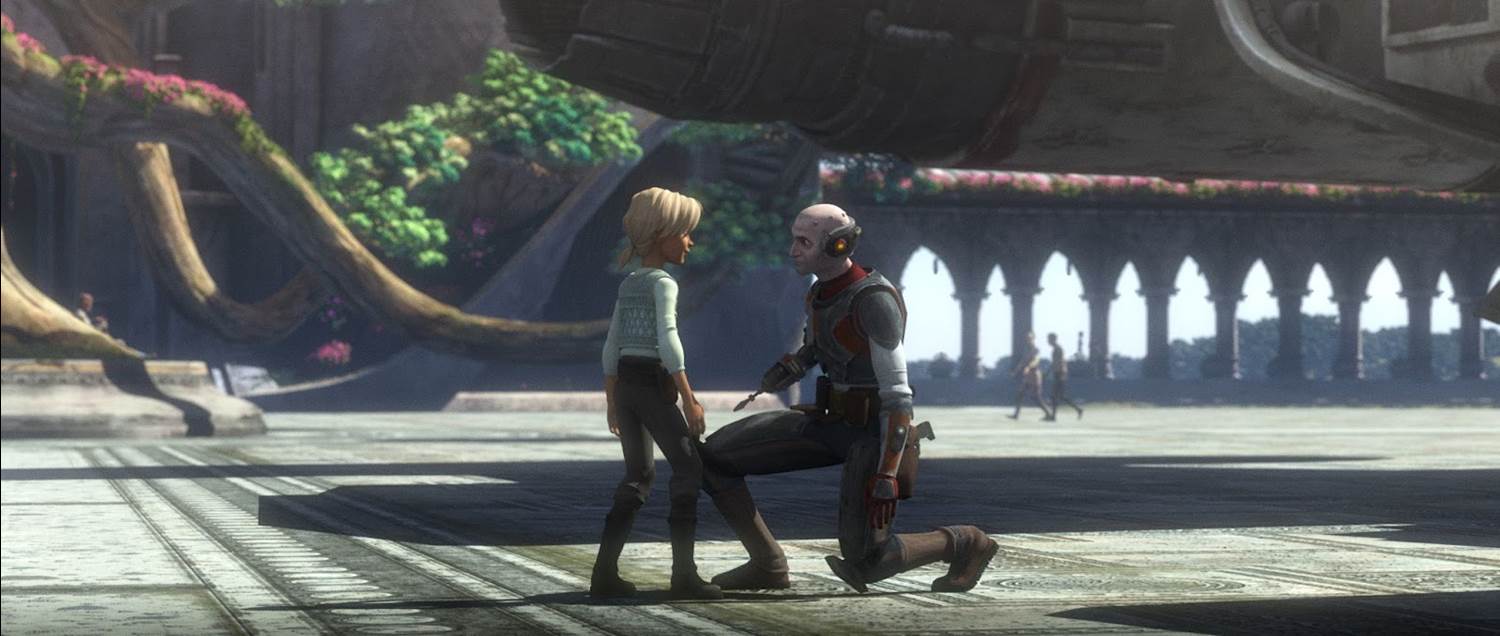 At the end of last week’s episode, the young female clone Omega (voiced by Michelle Ang) was finally reunited with her adult male brothers Hunter and Wrecker (both Dee Bradley Baker) after being helped to escape the cloning facility on Mount Tantiss by Crosshair (also Baker), who had served as one of their main antagonists over the past two seasons. And as “The Return" begins, the crew of the Marauder has gotten some sleep. Omega wakes up with her Tooka doll to find Wrecker and Hunter chatting in the hold of the ship, and they tell her that Crosshair had already left by the time they got up. So Omega ventures out to the shore (apparently they have returned to the island-planet of Pabu) to coax Crosshair back into the fold.