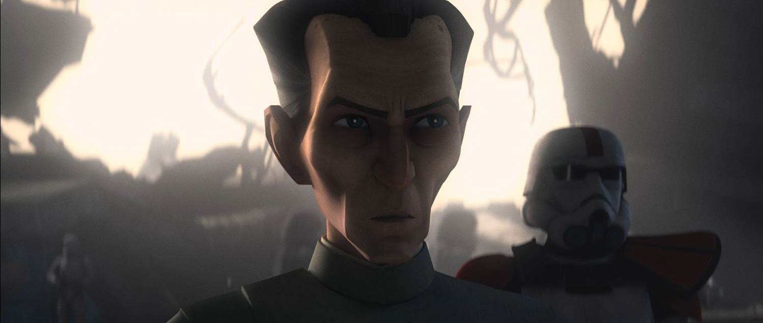 Thankfully, Nala Se is both literally and figuratively one step ahead of Rampart, and when he kills her it sets off the thermal detonator she’s holding in her hand, destroying both of them and the invaluable cloning data at the same time. Nala Se has a great line here about how the technology “will always be Kaminoan," foreshadowing how Emperor Palpatine will struggle to perfect Project Necromancer without her help all the way through to the events of Star Wars: Episode IX - The Rise of Skywalker. Hemlock gets a holo-call from Governor Tarkin (guest star Stephen Stanton), who is concerned about the pandemonium breaking out at the base, and insists he will be arriving himself to take things under control. Then there’s a couple really big exciting action scenes involving the Bad Batch breaking free of their restraints, combating the Clone X troopers, and eventually taking out Hemlock, who falls to his death from a landing platform outside of Mount Tantiss.