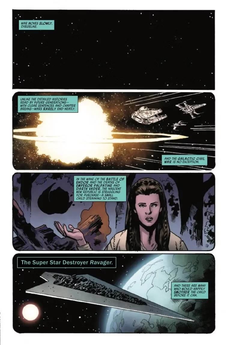 On Chandrila, currently serving as provisional home of the New Republic, Princess Leia meets with Mon Mothma and Agent Calder Behrens (newly introduced here) to put together a team to assess the Moff Adelhard situation. The group Leia assembles consists of Kes Dameron (father of Poe, featured in recent Star Wars comics), Rynn Zenat (the B-wing pilot we met last issue), Jarek Yeager (who becomes a regular character in the Star Wars: Resistance animated series later on in the timeline), and Therisa Alern (another newbie). And on Endor, Luke Skywalker gives Rynn her new assignment and heads off to find “something calling to" him. Then we cut to Tatooine and the former palace of Jabba the Hutt, where a freshly bandaged Bib Fortuna has taken control of the now-deceased gangster’s territory. The Spice Runners of Kijimi show up (Segura has experience writing about this group from the young-adult novel Star Wars: Poe Dameron - Free Fall) and their leader Zeva Bliss (mother of Zorii from Star Wars: The Rise of Skywalker) requests that Fortuna help them in aiding Adelhard’s forces, an offer Bib swiftly rejects. As they depart, Bliss tells her crew that it serves the Spice Runners to foment chaos in the galaxy, so she continues on with her plan, though one of Fortuna’s men is listening from the shadows.