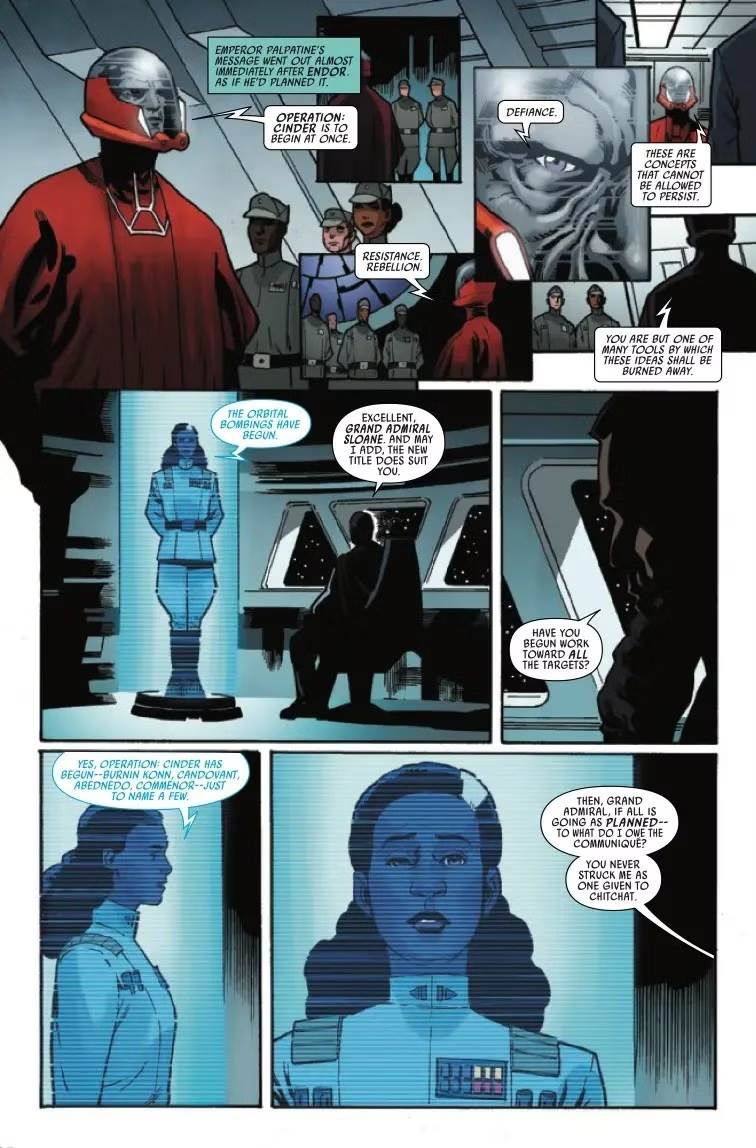 The Battle of Jakku - Insurgency Rising #2 begins with a shadowy conversation among the Acolytes of the Beyond (see the Star Wars: Aftermath book trilogy for more), wherein their further plans are set into motion. Then writer Alex Segura and artist Leonard Kirk cut to the Super Star Destroyer Ravager, where one of Emperor Palpatine’s Sentinel droids (from the Star Wars: Shattered Empire comic miniseries) initiates Operation: Cinder (which plays out in the Star Wars: Alphabet Squadron novels), and then Grand Admiral Rae Sloane (from Star Wars: A New Dawn and numerous other stories set during this period) appears in hologram form before an unnamed Imperial commander– using context clues I believe this to be Gallius Rax, whose code name is Operator. Rax dismisses Sloane’s concerns about Moff Adelhard, and insists that the problem “is already being handled." Then in the Anoat Sector, we see Adelhard execute a Rebel Alliance soldier who dares confront him with the concept that the Empire has fallen. Adelhard then takes other soldiers prisoner and orders his lieutenant to interrogate them for information “about this so-called New Republic."
