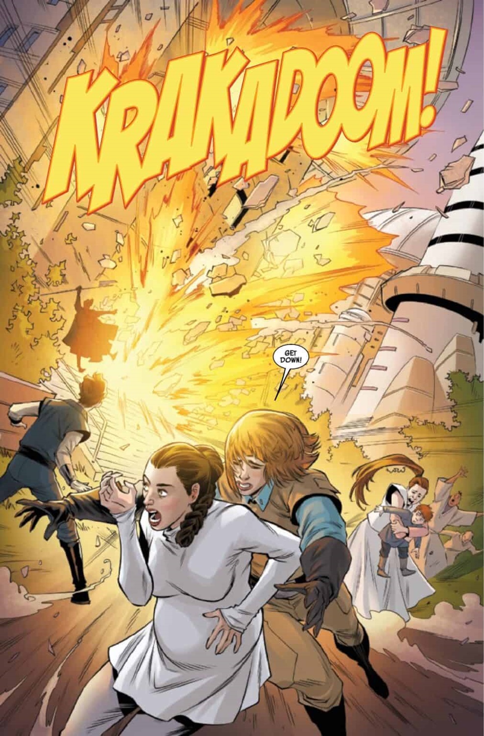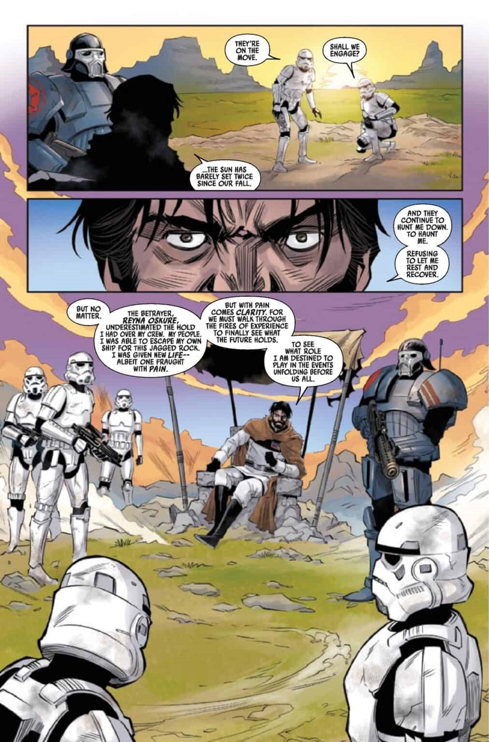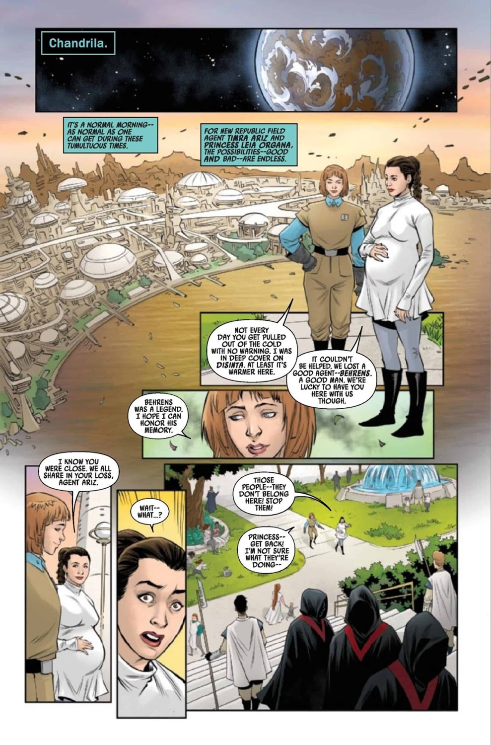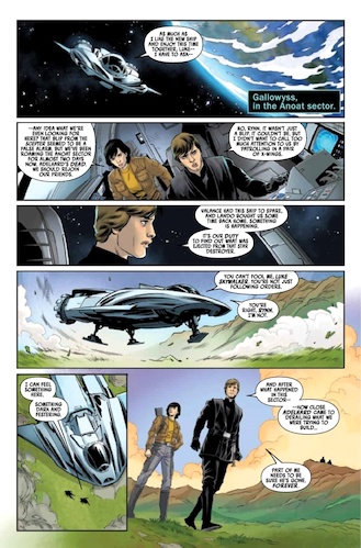 The Battle of Jakku - Last Stand #1 begins on the planet Chandrila, where Princess Leia Organa meets with New Republic field agent Timra Ariz (newly introduced here), who has been called in to replace Calder Behrens, who was assassinated at the end of The Battle of Jakku - Republic Under Siege. Suddenly there’s a big explosion nearby, and the two women quickly deduce that the Acolytes of the Beyond are responsible. In the scramble to arrest the hooded fanatics, Ariz is shot dead, leaving Leia to wonder how the New Republic has “fallen so far." Meanwhile in orbit around a planet called Galowyss, Luke Skywalker and rebel pilot Rynn Zenat search for any indication that Grand Moff Ubrik Adelhard may have survived their recently concluded battle. They land on the surface of the planet, where indeed not very far away Adelhard is recuperating from the crash of his escape pod along with Commander Bragh and a handful of stormtroopers.