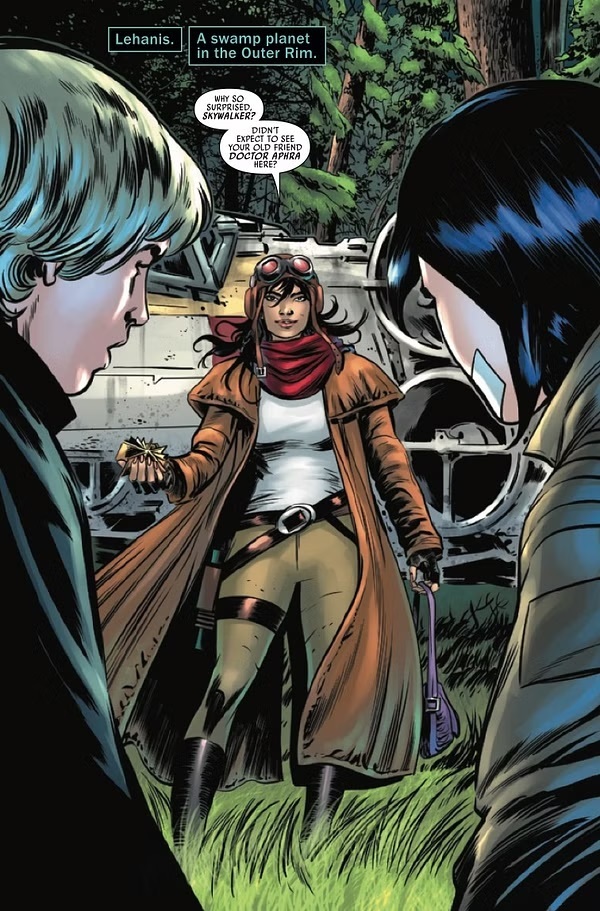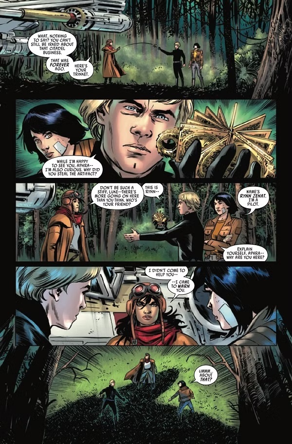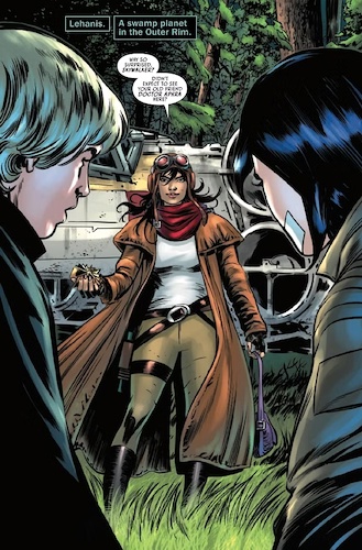 At that meeting, these officers discuss the biggest thorn currently in their sides– Grand Moff Adelhard, who has shut himself and his fleet off from the rest of the Imperial remnant and is making an effort to expand his forces outward into the galaxy. They decide to activate an “agent" in the Anoat sector and look ahead to the titular Battle of Jakku, which will see Palpatine’s posthumous wishes begin to be enacted. Back on Lehanis, Luke has Aphra take Rynn to safety while he deals with the Klyff’wat, and then Chelli spills the beans on why she’s actually there. It seems the compendium is a fake, and Adelhard has partnered with the Acolytes to use Luke’s pursuit of Jedi artifacts as a distraction from his true campaign against the New Republic. Speaking of which, Lando Calrissian and Rynn’s girlfriend Preeti are overwhelmed by Adelhard’s ships as they pilot the Lady Luck and an X-wing starfighter, respectively. Meanwhile, Adelhard brings in a couple of deadly– and very interesting-looking– assassins to take out some valuable New Republic targets.