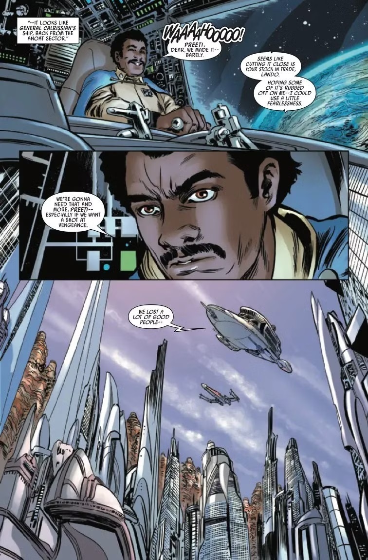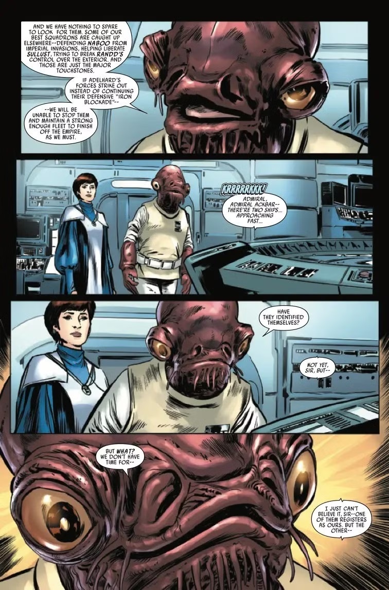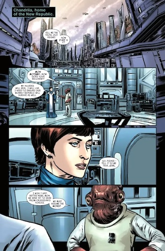 The Battle of Jakku - Republic Under Siege #4 begins on the planet Chandrila, which serves as the temporary home of the New Republic government after the conclusion of the Galactic Civil War. Here, Admiral Gial Ackbar meets with Chancellor Mon Mothma, who is recovering from as assassination attempt, as seen in the previous issue. Ackbar reports that General Lando Calrissian’s forces were likely lost in their recent confrontation with Grand Moff Ubrik Adelhard’s fleet, but on the following page we discover that Lando and a lone New Republic pilot named Preeti have survived the assault and made it safely back to Chandrila airspace. Meanwhile on the surface below, Luke Skywalker talks with his twin sister Princess Leia Organa about the looming decision of how to deal with Adelhard’s forces, especially in light of the new information about the Imperial Remnant amassing at Jakku. Then Mothma holds a briefing to let them know about the murder of her spy and advisor Calder Behrens on the planet Krassis.