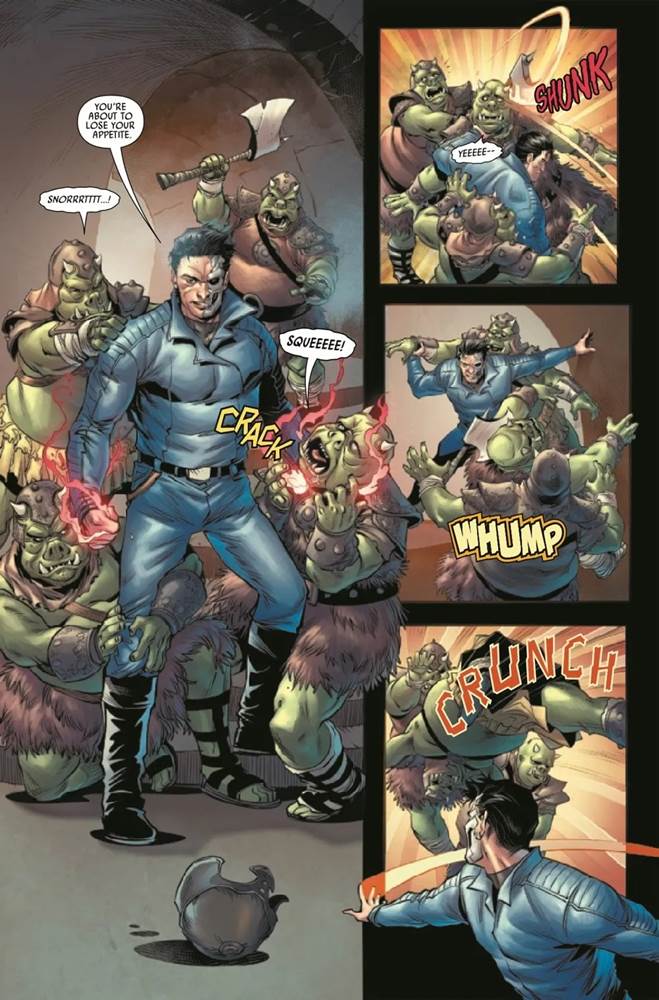 Jabba is broadcasting the battle between Beilert Valance and the Megadroid via hologram to his enemies in the rival crime syndicates as a show of strength, but we as fans know that Valance isn’t so easily defeated. His own secret weapon is his friends: T’onga, Losha, Zuckuss, and 4-LOM ride in on speeder bikes to help him combat the enormous droid. This plays out over a ten-page fight sequence that serves as a fitting climax to this often action-packed comic, and talented artist Jethro Morales does a great job in rendering it with energy and clarity, assisted by adept colorist Arif Prianto. But Sacks doesn’t let that battle conclude the entire story, as he’s still got a few surprises up his sleeve. We get a tip of the hat to the beginning of Return of the Jedi as Valance passes the task of rescuing Han off to Chewbacca, Princess Leia Organa, and Luke Skywalker. And then it’s time for all the regular Star Wars: Bounty Hunters characters to get really nice, emotional epilogue thanks to a collaborative reunion between Sacks and his former artist Paolo Villanelli, who drew the illustrations for 31 previous issues.
