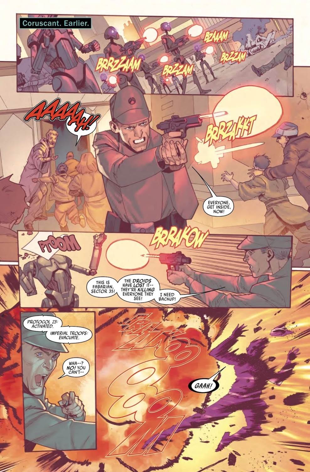 Next Pak and his artists Adam Gorham and Paul Fry cut to space, where Fabarian is on an Imperial Shuttle heading to meet with Sub-Administrator Sly Moore and the rest of the Schism Imperial, including Darth Vader himself. Fabarian admits that he’s a little afraid of Vader, having heard that the Droid Scourge had infected the Dark Lord. But Vader insists that all of his actions are of his own free will, and introduces Fabarian to the M.A.R. Corps– a group of Rebel Alliance cyborgs that have now been corrupted by Imperial technology. We also get reacquainted with Governor Tauntaza who says she has joined the Schism to reclaim her “death machine," using it to drain a planet’s life force and powering her armor with it. And then we get the big reveal that Fabarian has actually manipulated his way into the baron’s office in order to hack into his computer system– revealing that the industrialist is manufacturing a new model of battle droid for the Empire.