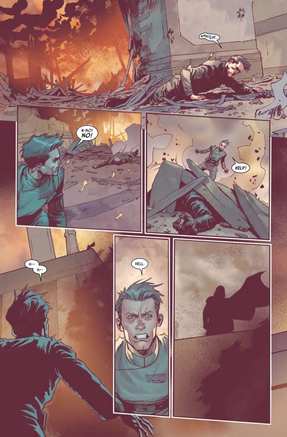 Darth Vader #44 takes an interesting approach by opening with a flashback to the events of the recent Star Wars: Dark Droids crossover, specifically the “Droid Plague" invading the Imperial capital on Coruscant. Here we meet an officer named Fabarian who fights valiantly to protect his sector, and then sees the titular Dark Lord of the Sith looming over the wreckage after Emperor Palpatine orders Protocol 23 and has that sector destroyed by bombardment. Then writer Greg Pak cuts to the “present" (still the period set between The Empire Strikes Back and Return of the Jedi) where we find that Fabarian has been demoted from an ISB investigator all the way down to a fine processor for having looked into the deaths caused by the assault. He gets sent to the office of a baron whose speeder he ticketed and there he has his remaining dignity stripped from him… or so it seems.