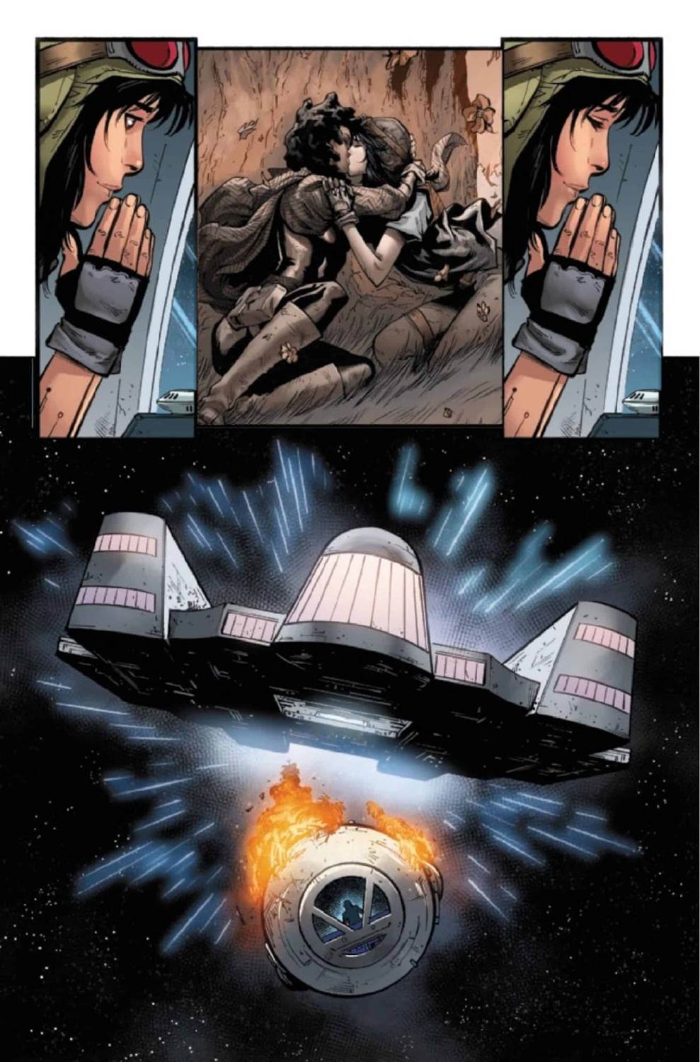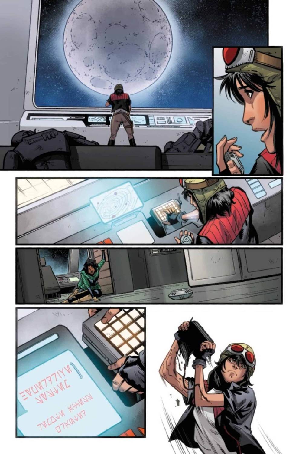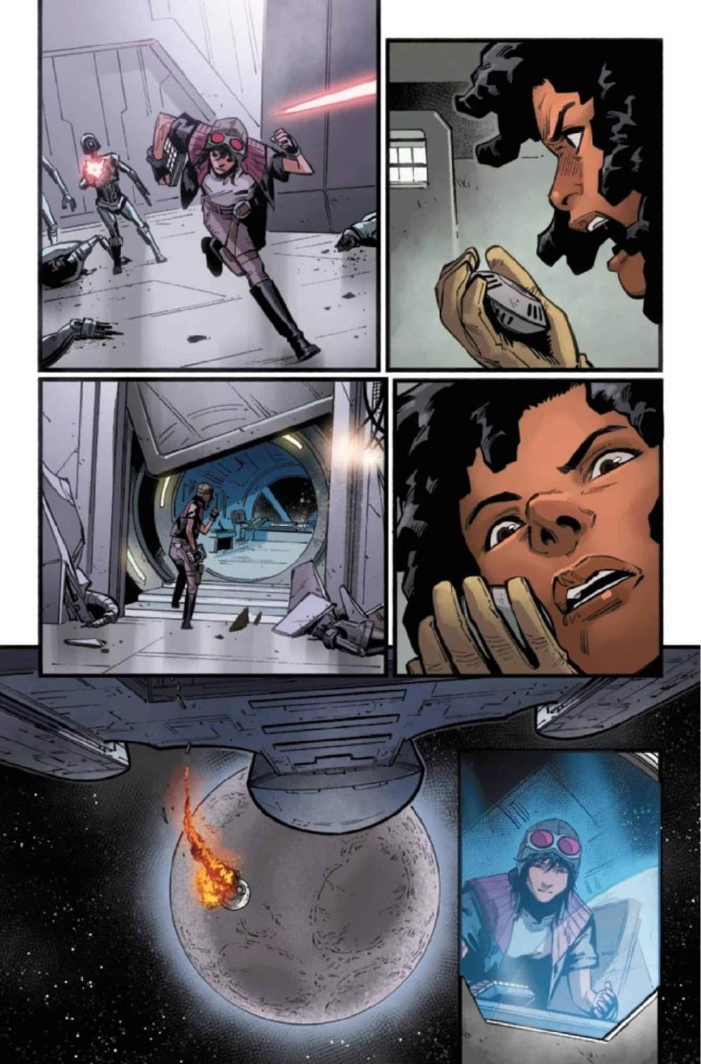 But once the space-dust settles on that particular misadventure, Sana decides she wants to go after Aphra, even though Domina insists there’s no way Chelli could have survived the devastating impact. But Starros knows better about Aphra’s tenacity, and we cut back to Rocedila, where the archaeologist makes a startling discovery: an ancient Jedi text, printed on actual paper in an honest-to-goodness book, which are pretty rare at this point in the larger Star Wars timeline. Here Chelli talks out loud to herself about what this find might mean for herself and her life going forward, but as readers we start to get the feeling that her character arc may mean she’ll find something more meaningful to do with the text (my guess is give it to Luke Skywalker, with whom Aphra remains acquainted). So some more inner monologue sees Chelli grappling with how she has indeed changed over the course of recent events, as she rushes outside grasping the book, and immediately encounters Sana Starros landing on the planet in her ship the Volt Cobra.