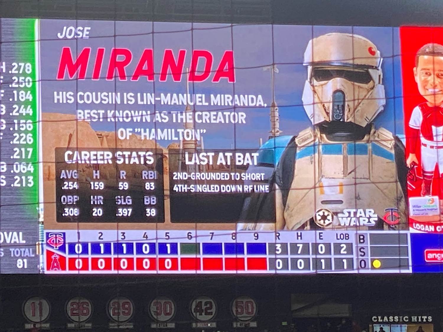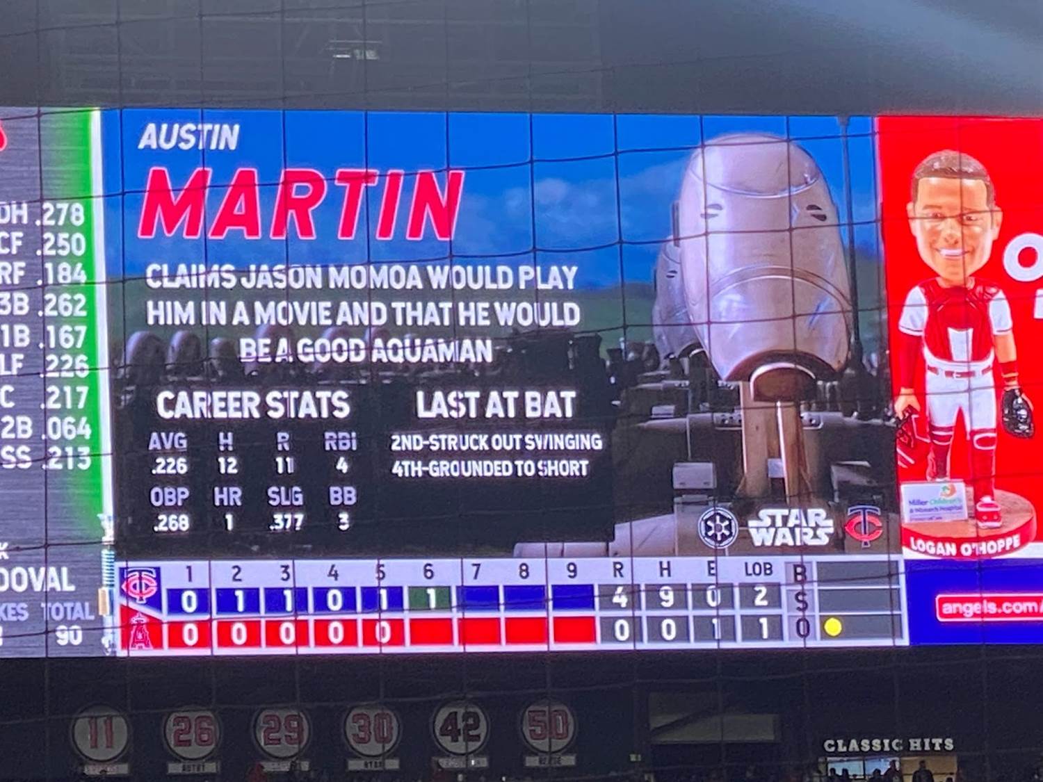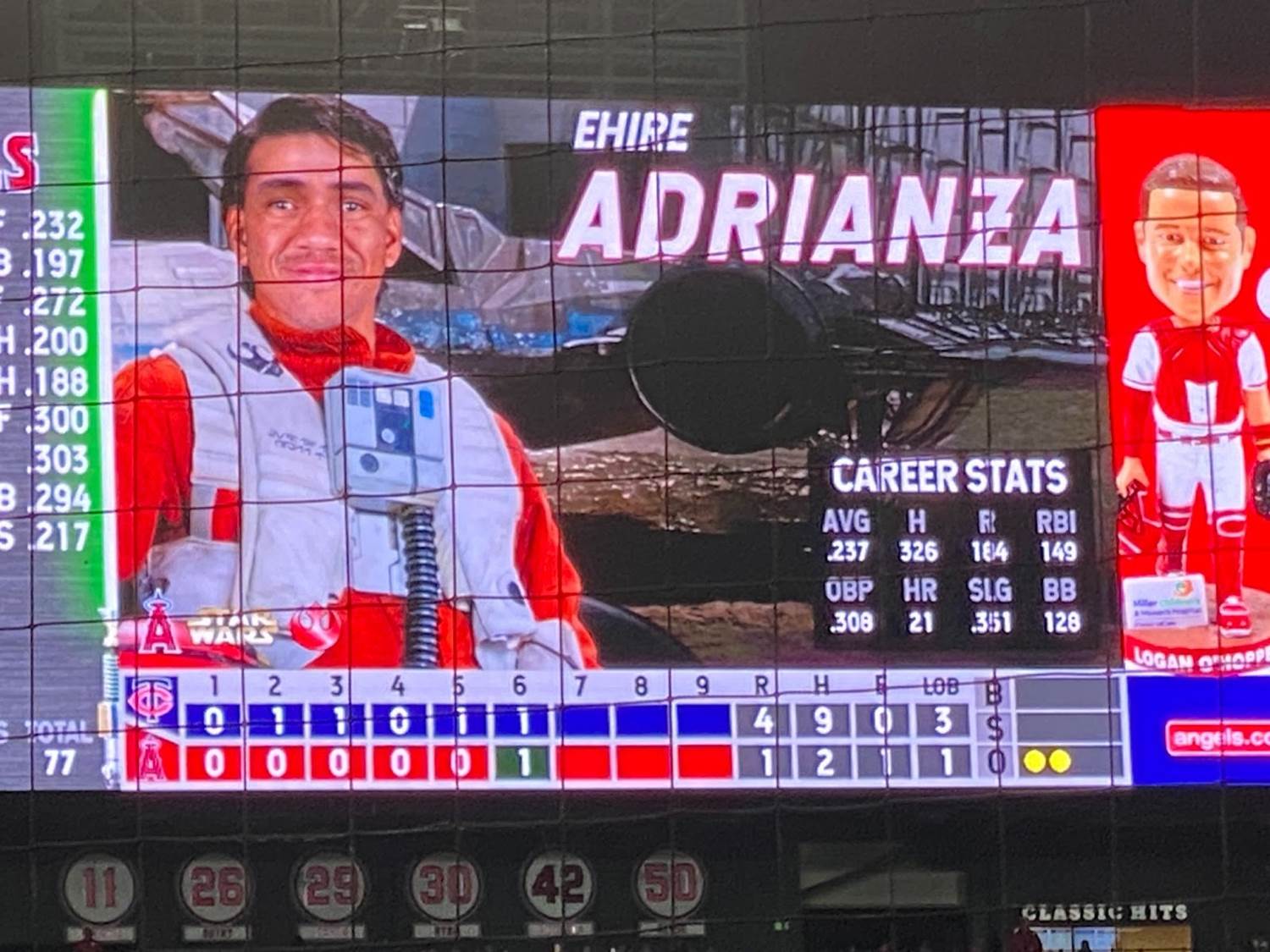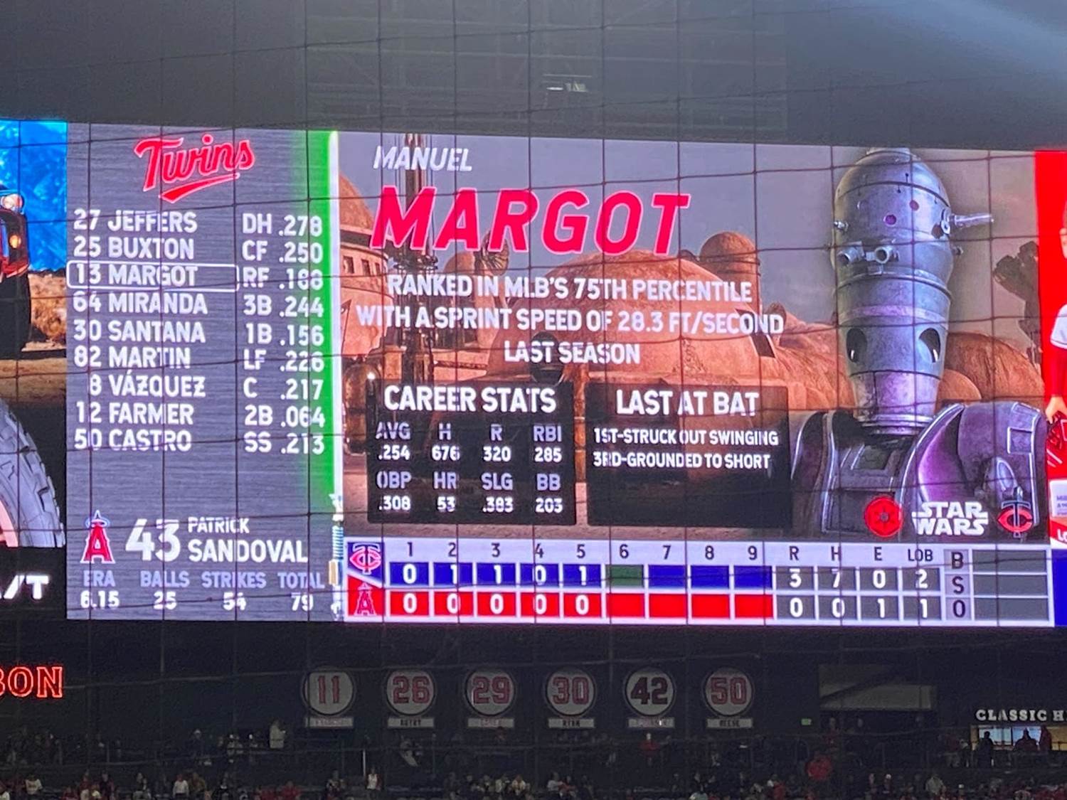 Another pretty memorable aspect of Star Wars Weekend at Angel Stadium was that each player was assigned his own Star Wars character on the scoreboard, with the visiting Minnesota Twins being represented by villains and the Angeles naturally playing hero characters.