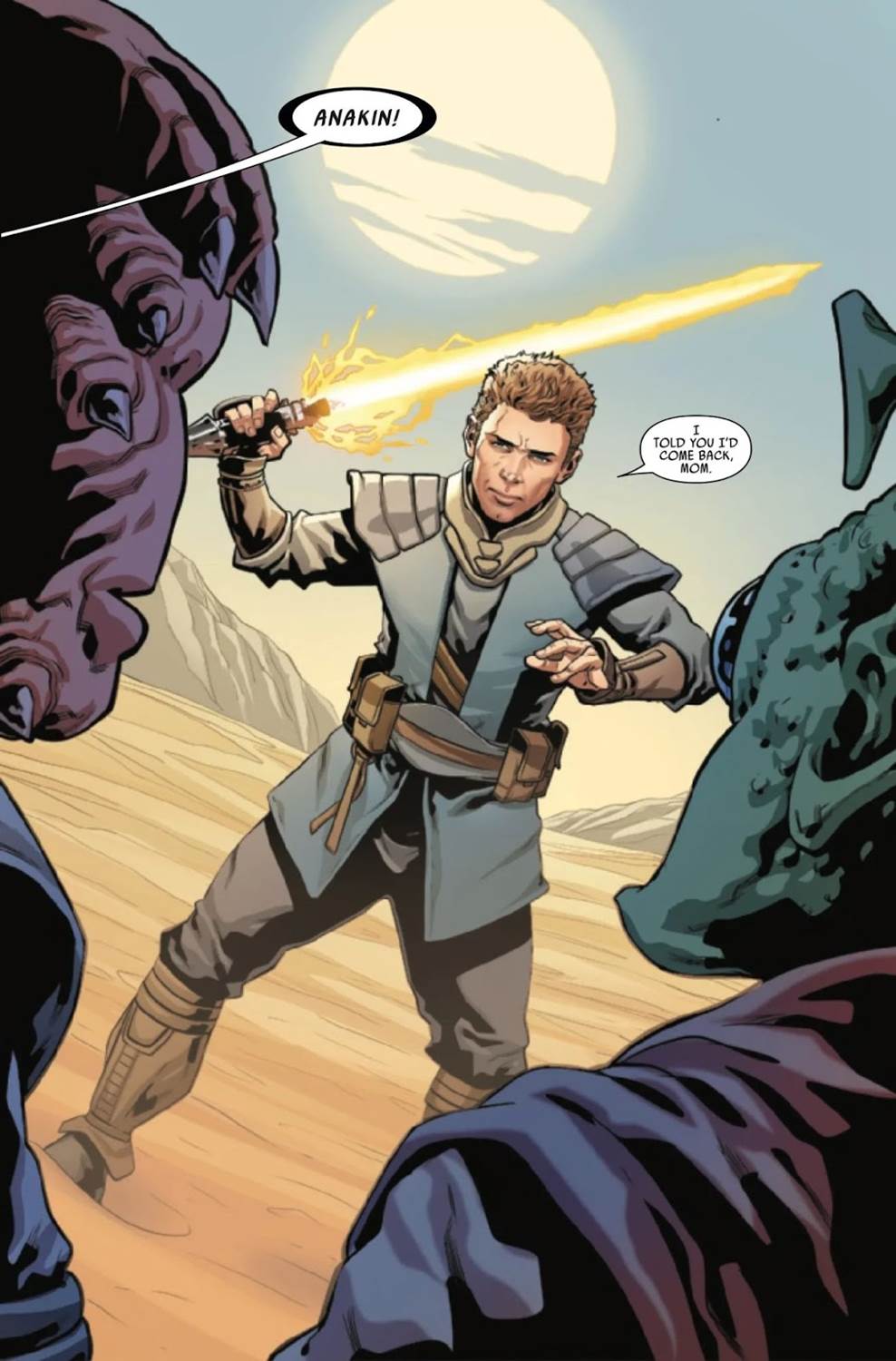 In the nearly 25 years since its release (the actual anniversary will fall on May 19th, later this month) it’s safe to say that general feelings toward George Lucas’s first Star Wars prequel have softened, as they tend to do with everything over time– this is coming from 44 years of experience immersed in the world of pop culture. And with the celebration comes a new comic book that retells the events of the 1999 movie from the perspective of Anakin Skywalker, which makes sense given that “lack of a real protagonist" is one of the most often-repeated critiques of the film. But this Anniversary Special opens with a vision of the future, wherein Shmi Skywalker is sold to Zygerrian slavers and is in the process of being shipped off Tatooine when her son Anakin returns as a Jedi Knight (wielding an unfamiliar-looking flickering yellow lightsaber) and rescues her. Then in the present day (prior to the events of Episode I), Anakin wakes up from his dream and is sent on a menial task to Mos Eisley to pick up a delivery for Watto.