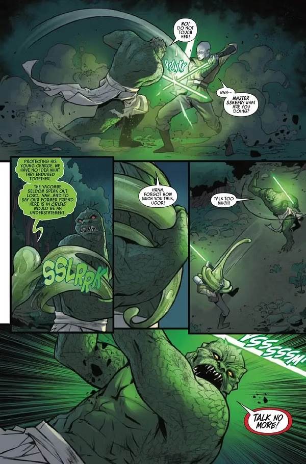 Here’s where the team spots the wily “Child of the Storm" H’Tar crawling away along the temple’s ceiling with the girl, and Tey tries to put a stop to her egress by using the dangerous Sith artifact called the Hand of Siberius, which carried over from Phase II. But Lourna intervenes, allowing H’Tar to escape, which irks pretty much everyone until Dee reveals that she planted a tracking device on the child. This leads us to the final scene of the issue and the pretty sweet reveal of Baron Bolan, the Ithorian mad scientist, and his diminutive assistant Reek who speaks with something very close to Yoda’s particular brand of backwards syntax. I absolutely love how weird things are getting in this comic, and I definitely trust writer Cavan Scott and his stable of (seemingly alternating) artists– this month it’s the talented Marika Cresta– to follow through on that promise. There’s so much potential for Boolan as a character, and we’ve only gotten glimpses of him before in other High Republic media, so I’m glad our heroes are on a collision course with this bizarre alien Dr. Frankenstein.