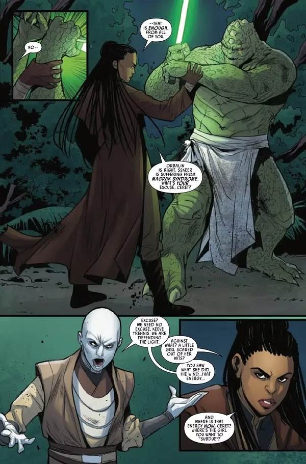 The High Republic (2023) #7 begins where the previous issue left off, with a number of Jedi Knights stranded in the woods on a planet behind the Nihil Stormwall. Jedi Master Sskeer has been recovered from his disease-induced rampage and subsequent disappearance, but he is still suffering from some of the effects of Trandoshan Magrak Syndrome. And he’s brought along with him a mysterious young girl of the Yacombe people, who are notoriously strong in the dark side of the Force. After the girl lashes out at Terec, the Jedi react aggressively, but Sskeer jumps to her defense. Then Keeve Trennis manages to talk everyone down, pointing out that their supposed enemy Lourna Dee, a former Nihil Tempest Runner, is the only one comforting the child.