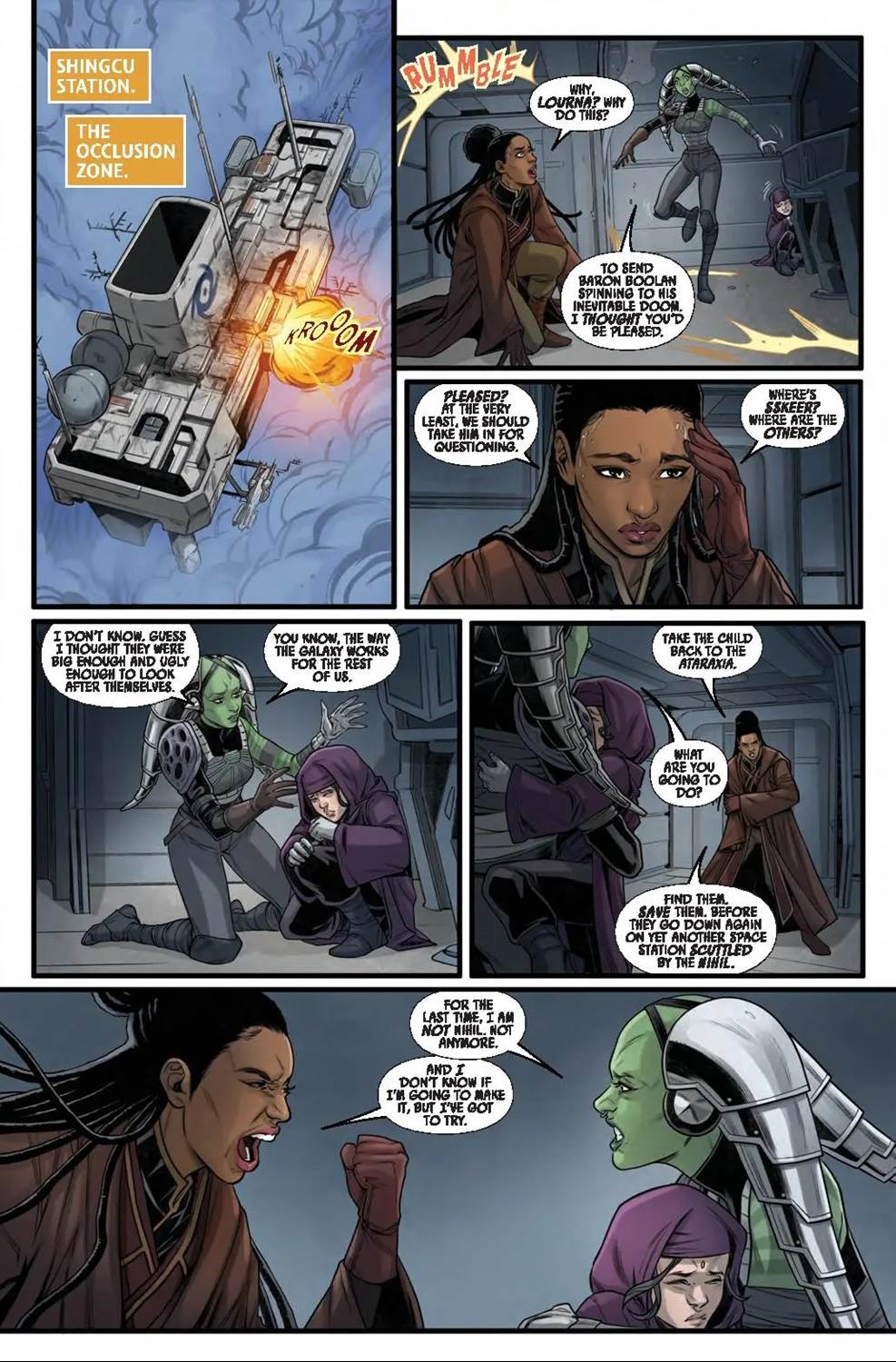 Boolan uses this new perception of Sskeer– who says he’s “not so sure" if he even considers himself a Jedi anymore– to whisper in the Trandoshan’s ear about how he could “help him rise again," while Dee is persuaded by Jedi Master Torbalin to return into the station to help. Here we cut to Terec and Ceret, who are attempting to disable one of Lourna’s bombs when they are interrupted by Boolan’s Igor-like assistant Reek and two Nameless– one of which is still alive and active despite now being headless. The bomb explodes, affecting everyone aboard the station in different ways. One hero and one villain– Terec and Rrkak, specifically– apparently die in the chaos, and Sskeer flees with Boolan aboard the mad scientist’s own personal stormcruiser. On the Ataraxia, Torbalin repairs and revives Lourna Dee’s protocol droid Q4, but they’re also using the ship’s tractor beam to hold the station together so they can’t head off Boolan’s cruiser. Instead, Lourna takes it upon herself to do so in one of the Jedi Vectors.