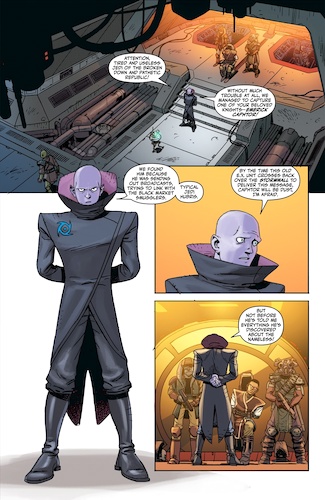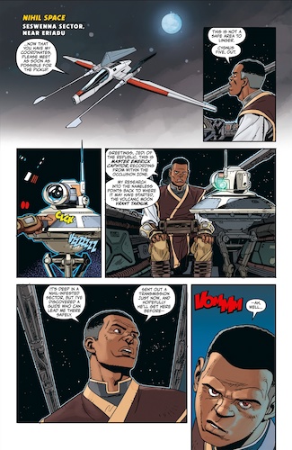 The High Republic Adventures - Dispatches from the Occlusion Zone #3 begins in the Seswenna sector of Nihil space near the planet Eriadu, where Jedi Master Emerick Caphtor sends a transmission back to the Republic about his investigations into the origins and nature of the Nameless creatures. His Jedi Vector starfighter is suddenly beset upon by the spider-like ship belonging to the Nihil’s mad scientist Niv Drendow Apruk, who takes Caphtor into custody and sends out a transmission of his own to the Jedi Order. Then Niv Drendow (yes, he has two first names and won’t let you hear the end of it if you say it wrong) demands that Emerick turn over all of his research pertaining to the Nameless, bringing the captured Jedi along with him to his home moon of Vrant Tarnum, where another Nihil scientist named Baron Boolan served as his mentor, though secrets were kept from Apruk.