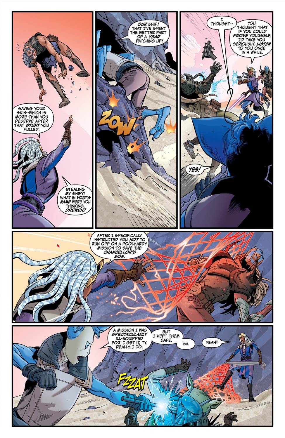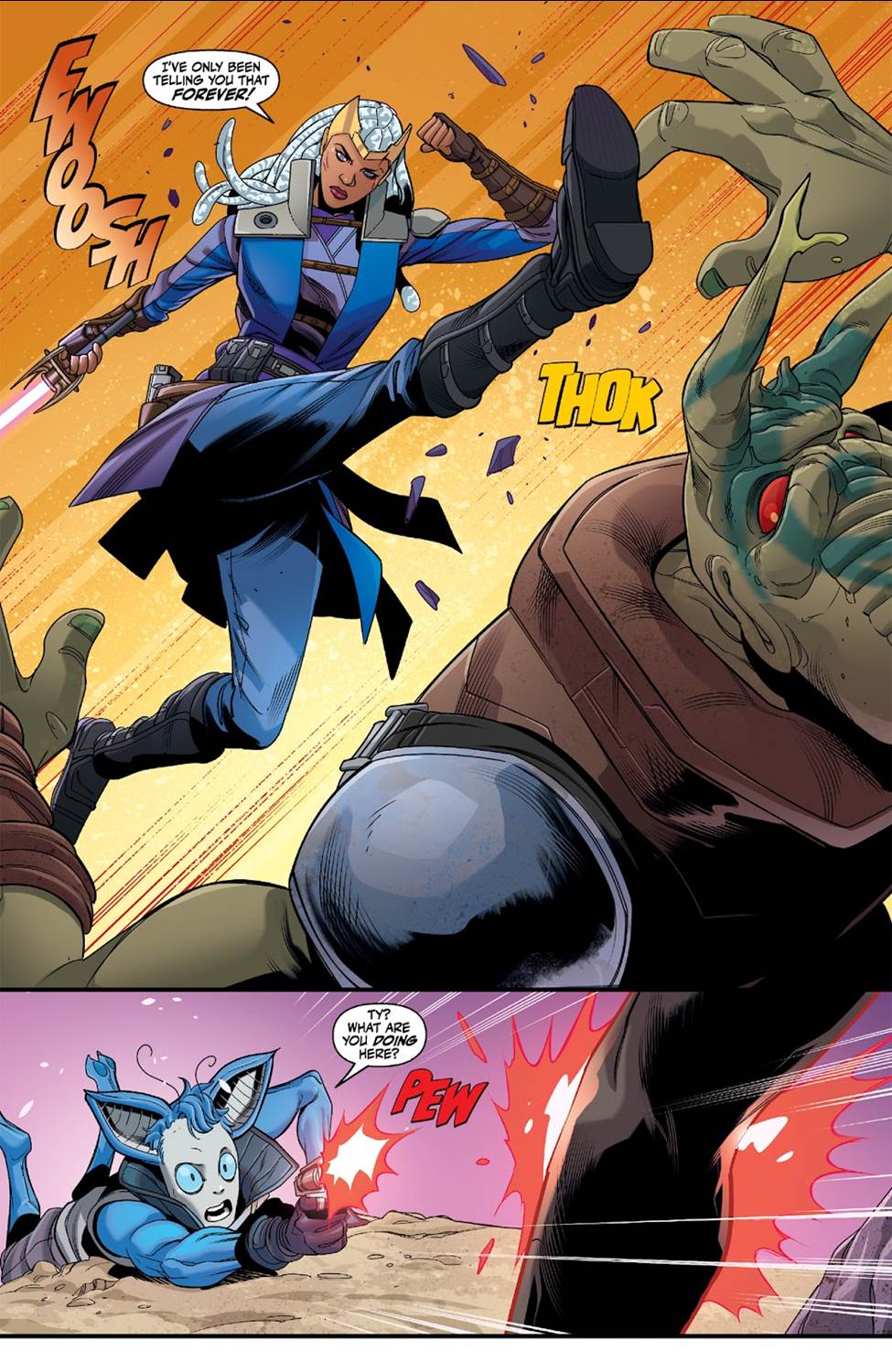 The problem arises when Ty and Drewen (I had honestly completely forgotten he was Force-sensitive) begin to feel the effects of a Nameless creature nearby. Ty instructs her pseudo-Padawan to take Kip and Jom further into a cave system as she goes out onto the beach to confront the Nihil holding this Nameless’s leash– who turns out to be Tylera’s old Gran Jedi Master, Cibaba. Through flashbacks, we learn that in the wake of Ty abandoning the Jedi Order, Cibaba was abducted and experimented on by Baron Boolan, becoming the cyborg monster he is in the “present" of this story. There’s a skirmish on the beach, with Cibaba setting his Nameless loose into the caves and pinning Ty up against the rocky walls using the Force. Inside the cave system, Drewen is set upon by the Nameless, but Kip jumps in for the rescue, knocking the deadly Force-eating creature down into a chasm below. Then outside, Ty is saved by none other than Lene Kostana, the young Force-wielding Altiri girl she had protected from the Nihil in previous issues.