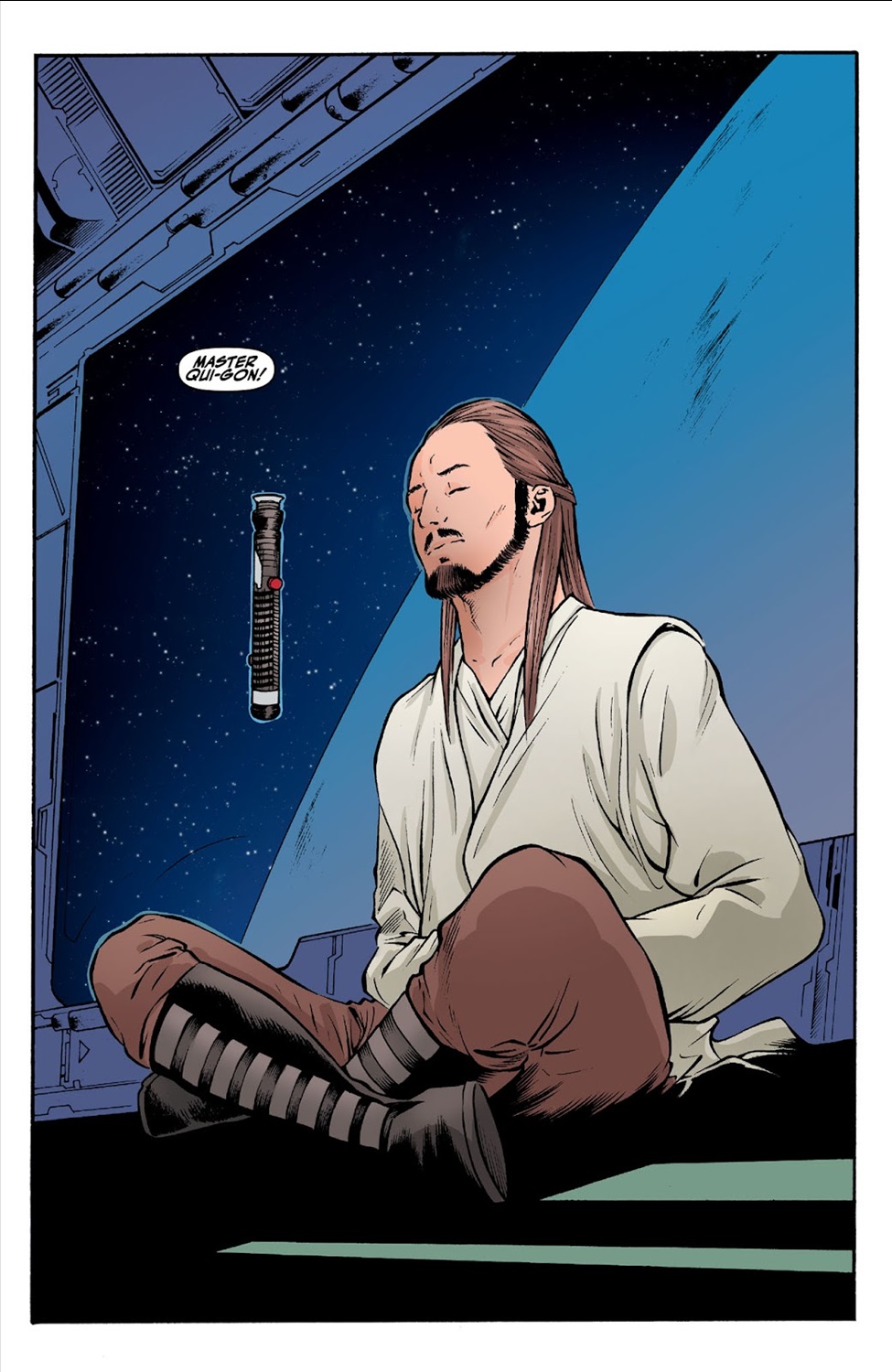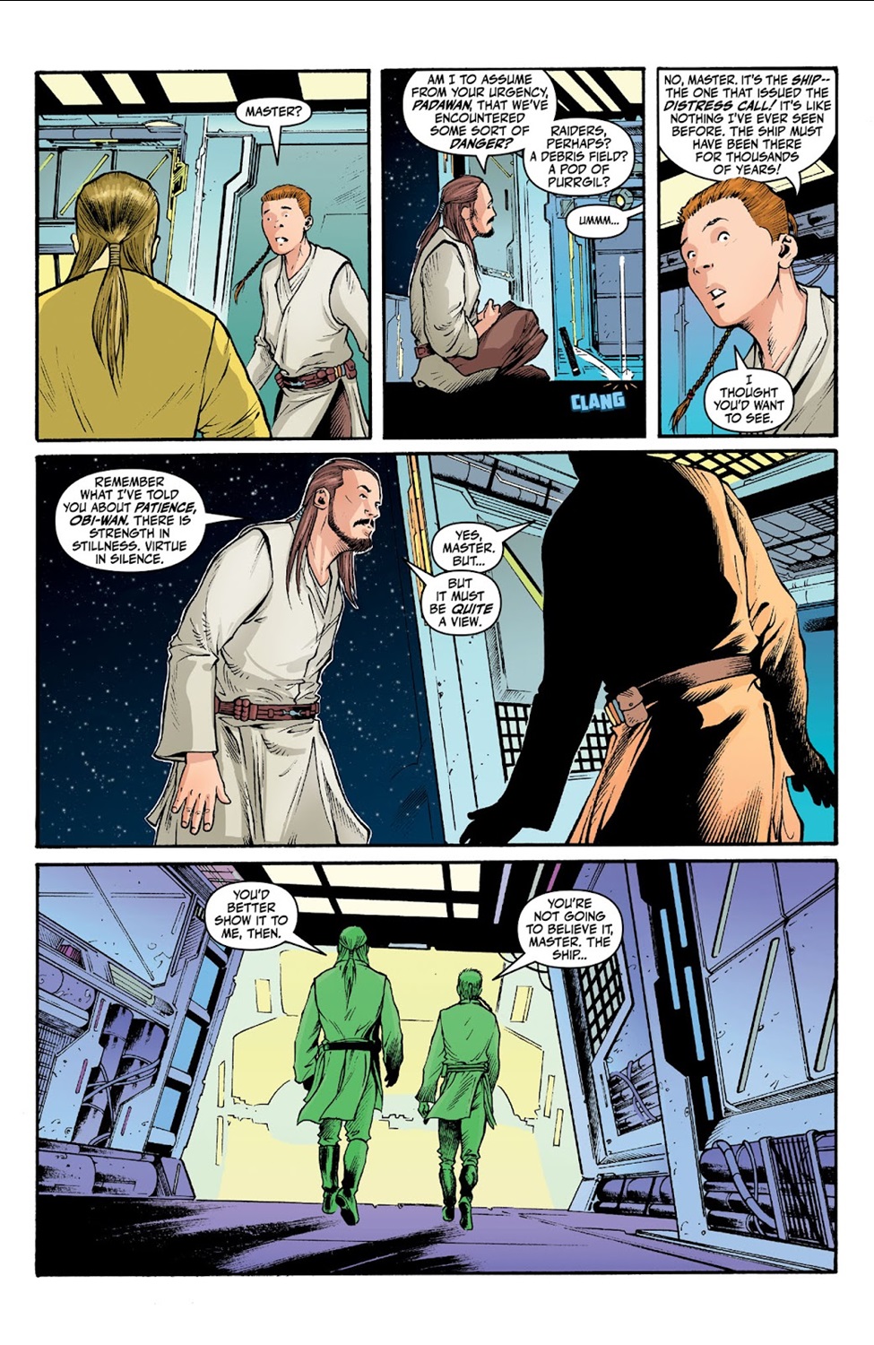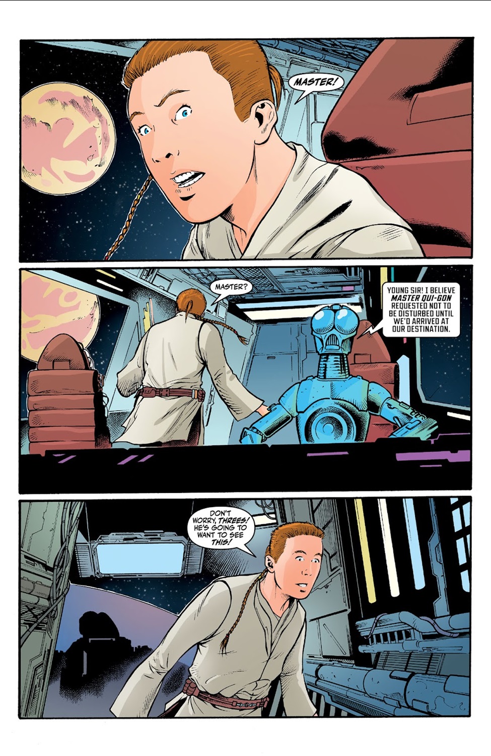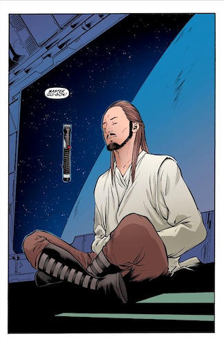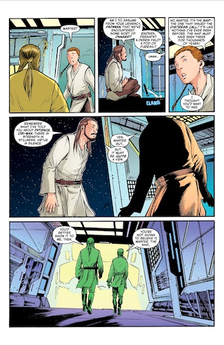 Much like Marvel Comics’ Star Wars: Jedi Knights ongoing series that launched today, Hyperspace Stories: Qui-Gon is set prior to the events of the prequel trilogy while the title character’s Padawan learner Obi-Wan Kenobi is a young teen. It’s unclear which of these stories actually takes place chronologically first in the larger Star Wars timeline (Wookieepedia says it’s this one) but that doesn’t really matter. Our tale begins with Qui-Gon and Obi-Wan (apparently traveling aboard the Consular-class Republic cruiser Radiant VII, which gets destroyed on-screen in Star Wars: Episode I - The Phantom Menace) arriving at the site of a distress call they received. The source turns out to be a group of scientists who have discovered a centuries-old wreckage of a ship that once belonged to the dark-side Force sect known as the Brotherhood of the Ninth Door (see 2022’s Star Wars: The High Republic Phase II stories in which this religion was introduced).