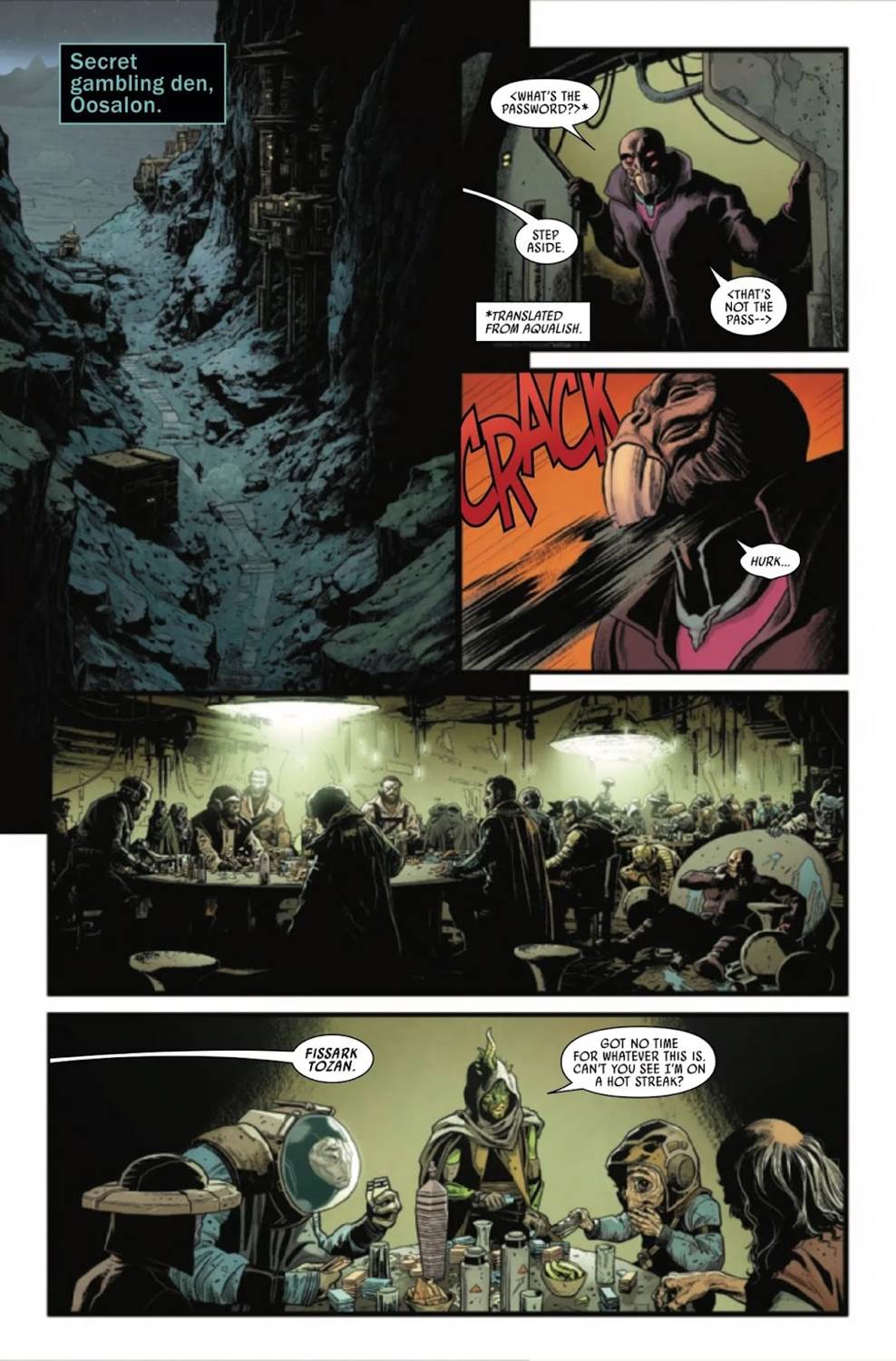 Jango Fett #1 begins with a bounty-hunting mission similar to what we saw at the top of the first-ever episode of The Mandalorian on Disney+-- basically a way to show off how good (and ruthless) the title character is at his job. Jango busts up a seedy gambling den on the planet Oosalon (from a Star Wars Rebels episode) to claim his prize, leaving nothing but death and destruction in his wake. Then writer Ethan Sacks (previous of Marvel’s Star Wars: Bounty Hunters, which ended just a couple months ago) cuts to the Regional Republic Headquarters on Jaloria, where a representative is bringing together the warring species of Nautolans and Anselmi– or is it the other way around?-- from Glee Anselm in apparently successful peace talks. As a symbol of this newly achieved treaty between the two races, the Republic is returning a museum piece called the Hope of Glee Anselm, containing two enormous jewels symbolizing each species, to the world.