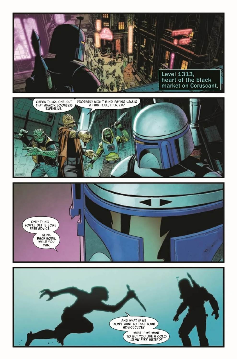Jango Fett #2 begins on Coruscant’s infamous Level 1313 (which once was planned to serve as the namesake of an eventually cancelled video game starring Jango’s son Boba Fett), where the titular bounty hunter is searching for information on the stolen gem known as the Hope of Glee Anselm on behalf of his client, the Republic. He encounters and deals with some Trandoshan thugs, then confronts a group of Anselmi who are plotting to retrieve the gem themselves with the help of an information broken who Jango then interrogates for details on a ship that was spotted leaving the planet Jaloria after the heist. As Fett returns to his ship with the info, the paroled convict Aurra Sing follows him with a sniper rifle, under the command of the Mirialan Judicial Huijari. They follow him to Hallitron-7 in the Jalor Sector, where Jango is sent by fixer Kligson (last seen in the now-concluded Star Wars: Bounty Hunters comic book by the same writer, Ethan Sacks) in pursuit of the aforementioned ship.
