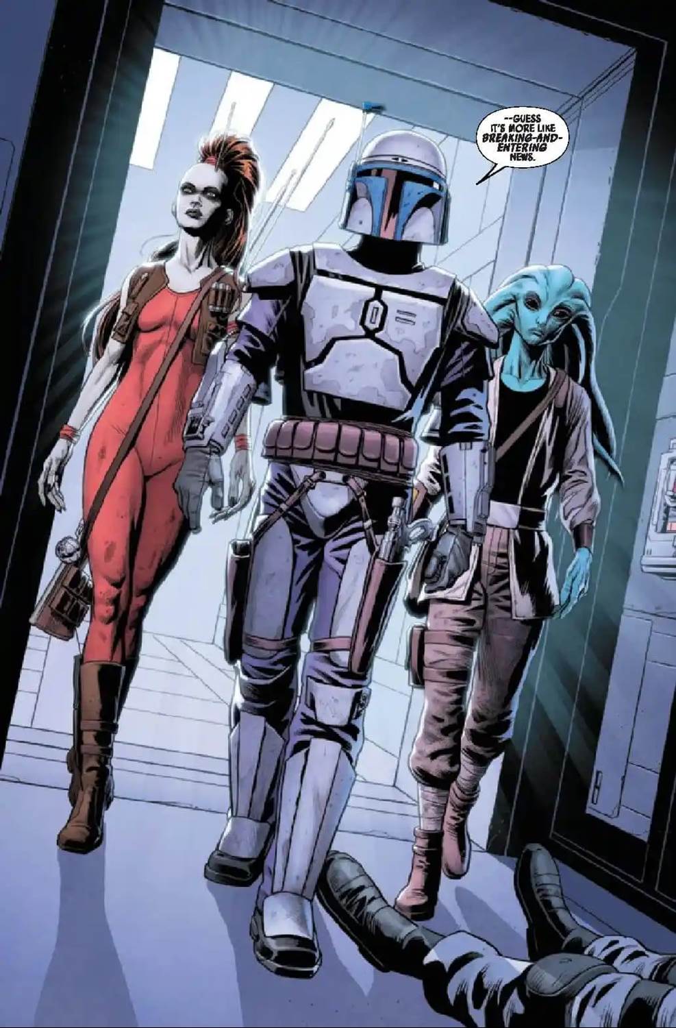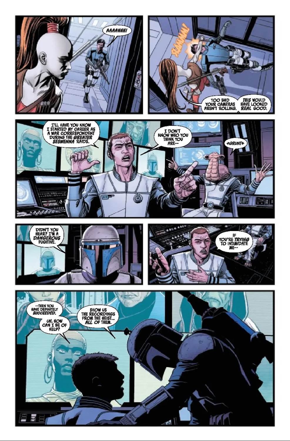 Jango Fett #4 begins on Ord Mantell, where a HoloNet News crew broadcasts current-event stories from around the galaxy. Suddenly the titular bounty hunter breaks into the station along with his cohorts Aurra Sing and Nakano Lash, who demand to see any and all footage from the recent heist of the Hope of Glee Anselm statue. While watching the footage, Lash realizes that it must have been the Nautolan Ambassador Fiarok who set up Nakano’s crew to take the fall for the crime, switching out the statue with a fake. So Jango and Aurra take an RX-series camera droid from the HoloNet station and leave Lash to her own devices instead of turning her in, inspiring her to go on to become a bounty hunter (as we see in writer Ethan Sacks’ other series Star Wars: Bounty Hunters, which is set later on in the timeline). Then they travel toward the planet Jaloria aboard the Slave I, while having a fairly on-the-nose discussion about whether or not Fett is ready to become a father (this comic is set just before the beginning of the Star Wars prequel trilogy, so young clone Boba has not been “born" yet).