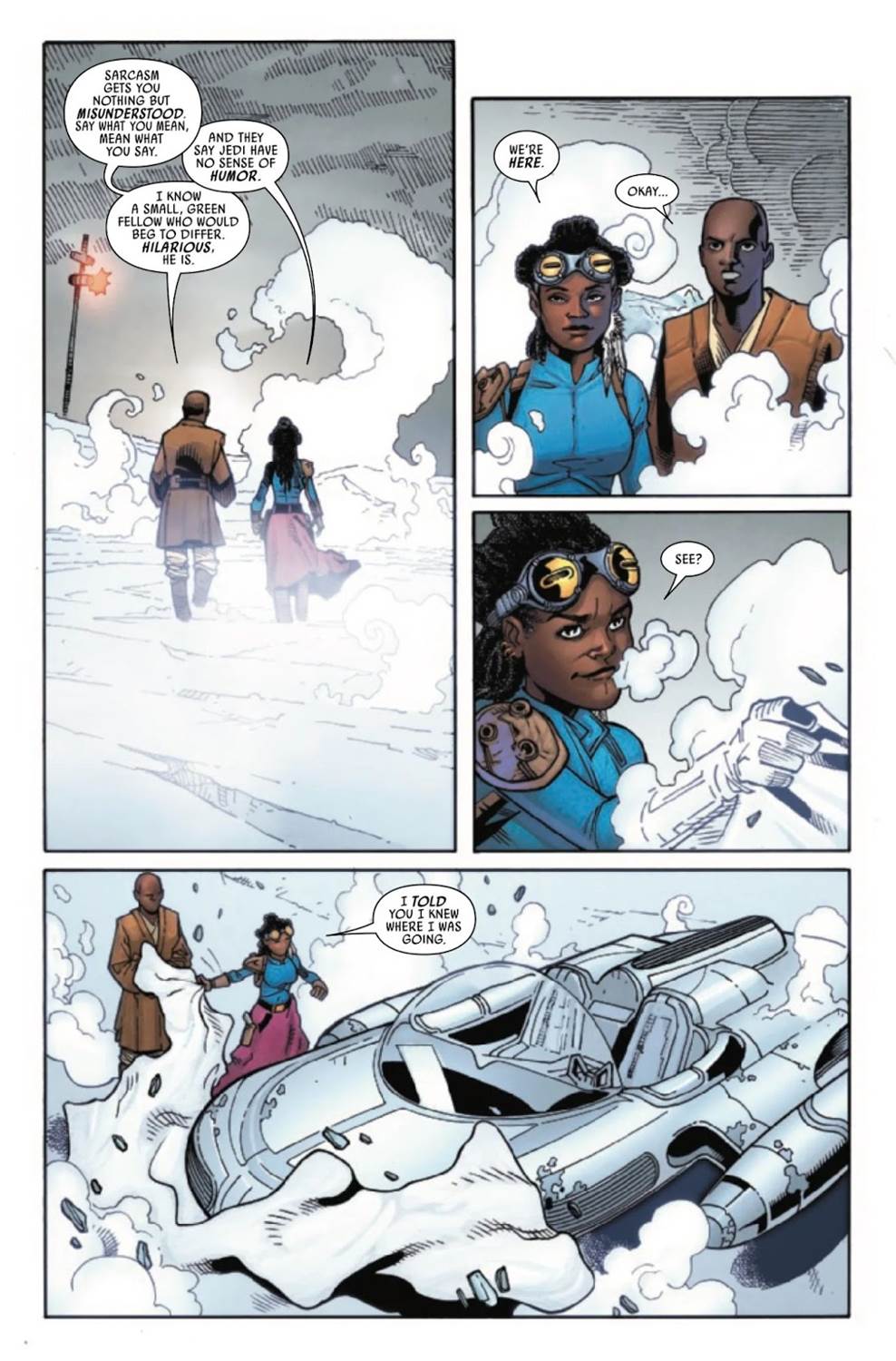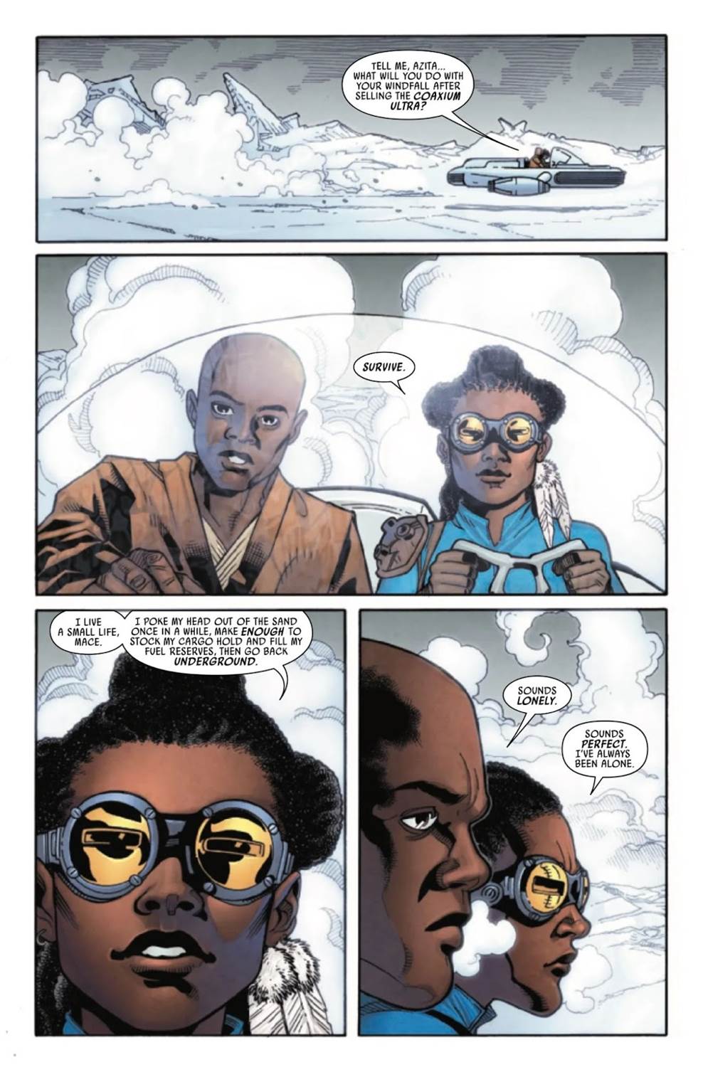 Mace Windu #3 picks up where the previous issue left off with the titular Jedi Master and his newfound pirate companion Azita Cruuz having left the cave system on the refinery moon of Ro Mira with Azita’s supply of the hyperfuel called Coaxium Ultra. We learn a little bit more about Cruuz’s orphan past on Haruun Kal– which was also Mace Windu’s homeworld– before our two protagonists are chased in their landspeeder by the Ro Mira refinery’s security patrol. So Mace finally convinces Azita to sell the Coaxium Ultra to the Jedi Order and takes control of the situation, dismissing the security force. Sadly this newfound peace does not last terribly long, as the security ships are pretty much immediately destroyed by Yaya Shram, a tiny Anzellan bounty hunter working for Jabba the Hutt.
