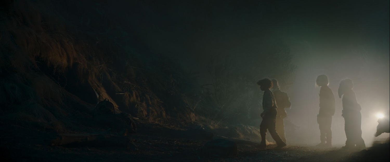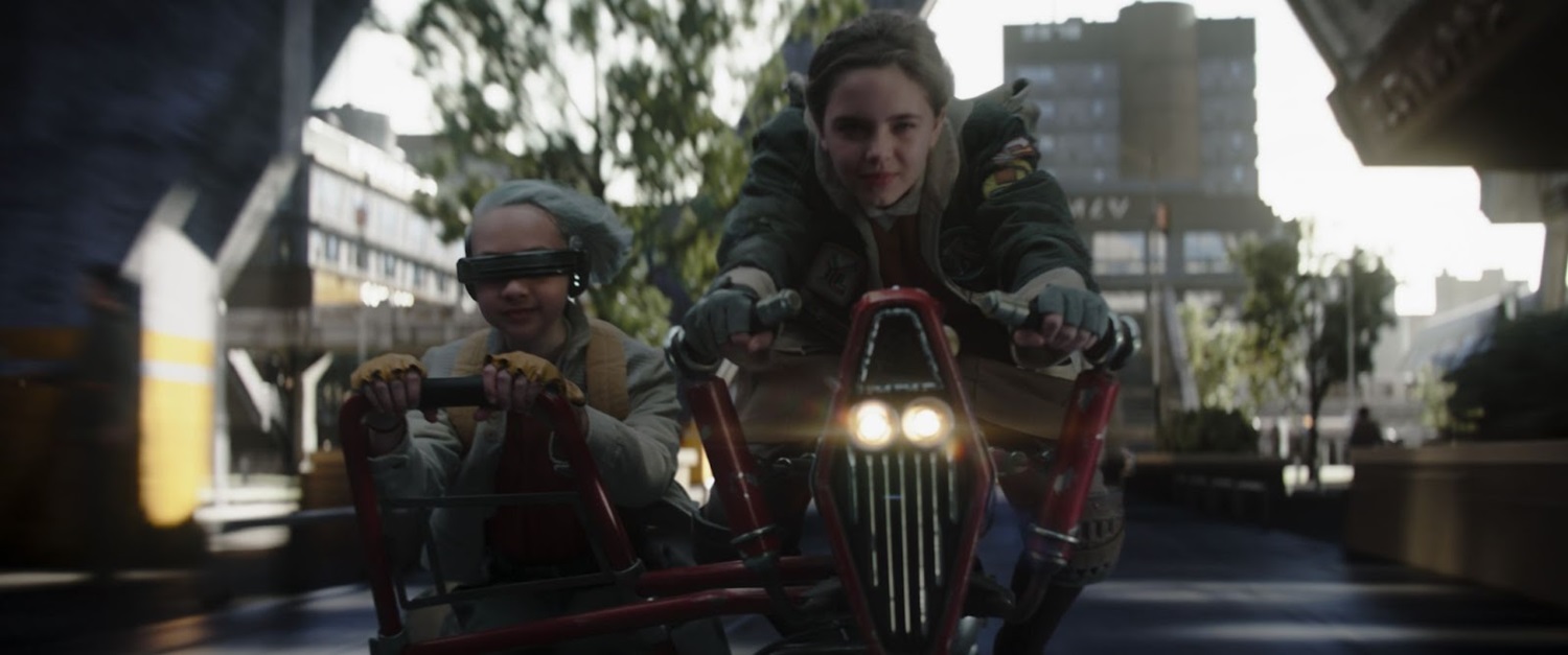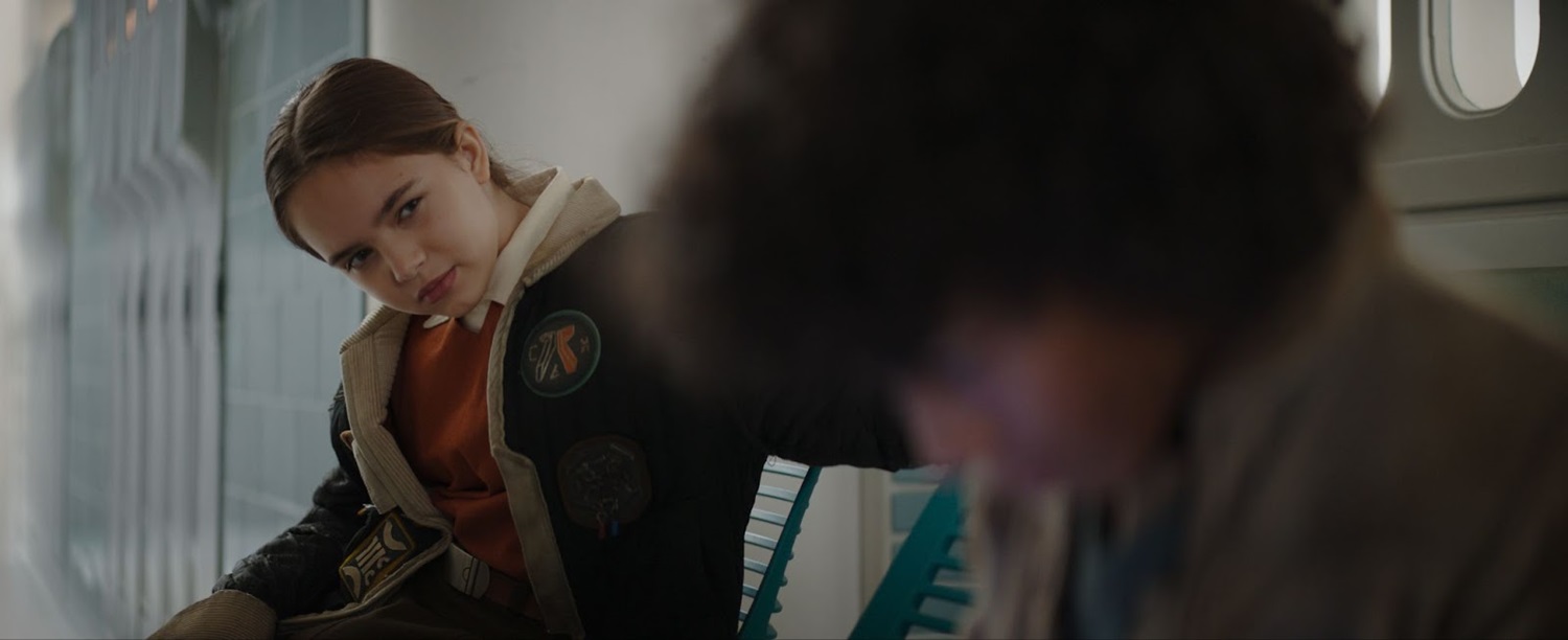 Then we cut to a polar opposite location and situation– a pseudo-suburban (though undeniably futuristic) neighborhood and household where we meet young Wim (Robert Cabot-Conyers, who Disney fans will know as the voice of Antonio in Encanto), who plays with crude Jedi vs. Sith action figures and imagines a more exciting life somewhere out there in the galaxy. Wim’s best friend Neel (Dear Santa’s Robert Timothy Smith) is a blue elephantine kid whose species currently goes unidentified– though we do know he’s not an Ortolan like Max Rebo– and the two are kind of the losers in their school. They both admire the cooler kids, especially the speeder-bike-racing girls Fern (Ryan Kiera Armstrong from American Horror Story) and KB (Kyriana Kratter from Disney Channel’s Bunk’d), the latter of which is an electronic-visor-sporting cyborg like Lando Calrissian’s pal Lobot from The Empire Strikes Back. When Wim oversleeps one night, missing an important test, he takes a shortcut through the woods near his home and stumbles across a hatch buried in a ravine, which he assumes is a Jedi temple like the ones he’s read about in histories of the galaxy.