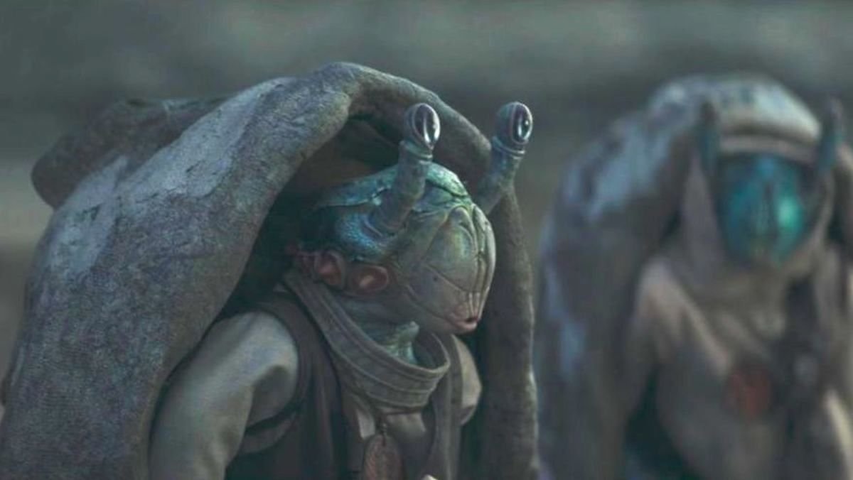Among the alien species that greet Jod at the landing pad is a Xi’Dec, the same bulbous race as opera singer Ubbla Mollbro from Canto Bight in Star Wars: The Last Jedi.