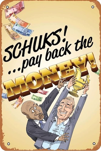Schuks, the hapless loser, gets himself into trouble when he loses the Currie Cup. This is not some spicy dish, but rather the most important cup in all of rugby in South Africa. Arrested, Schuks could have a million dollar fine coming his way, until the Sports Minister intervenes.