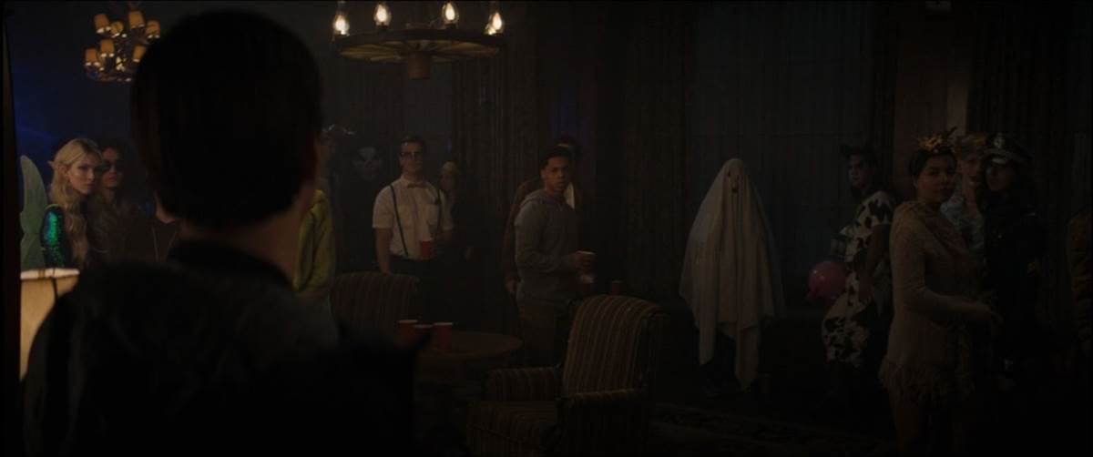 The front of the house is soon swarming with cars and teenagers arriving. Lucas has fake stitches on his head for his costume, prompting Margot to ask what he’s supposed to be. “A guy with brain damage, he tells her." She says she’s supposed to be a spy. Lucas shows her a red Solo cup full of live worms, which he tells her he found in the kitchen. Margot tells him she’s mad she came as she watches Isaiah and Allison have a fight.
