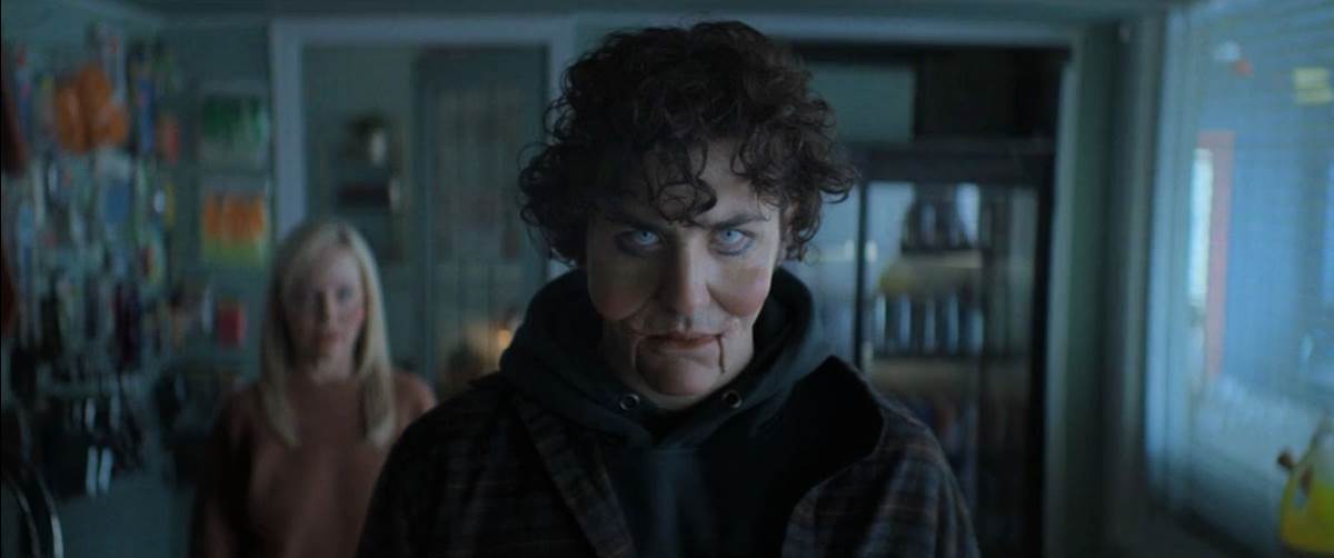 The sun has set by the time Lucas pulls up to their school. The teens stay in the Jeep as they watch him dismount, facing away from them as he removes his helmet. He slowly turns around, and they see that he’s become a dummy, pointing at them. Just then, all four doors of the Jeep are pulled open by their dummy parents, who drag the teens out and onto the football field, where tents have been erected, and a wooden tower is being quickly built by an army of dummies.