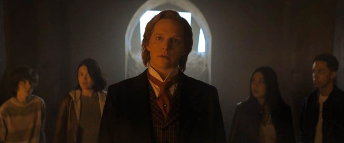 The human who emerged from Slappy at the end of the previous episode is seen in a flashback to 1879. He’s in the trenches of a battlefield, where he gets shot in the abdomen. The end seems near until an explosion sends him falling through the earth into a concealed tomb. He’s bleeding, but has enough strength to ignite his lighter to see where he is. He sets fire to a path of oil that illuminates the chamber, which is covered in inscriptions in another language, one the man seems capable of reading. Three words glow brightest, as if calling to him, so he recites them. “Memori Hosanna Kanduu." Suddenly, the blood that was leaking from his wound retreats back inside him. The wound heals.
