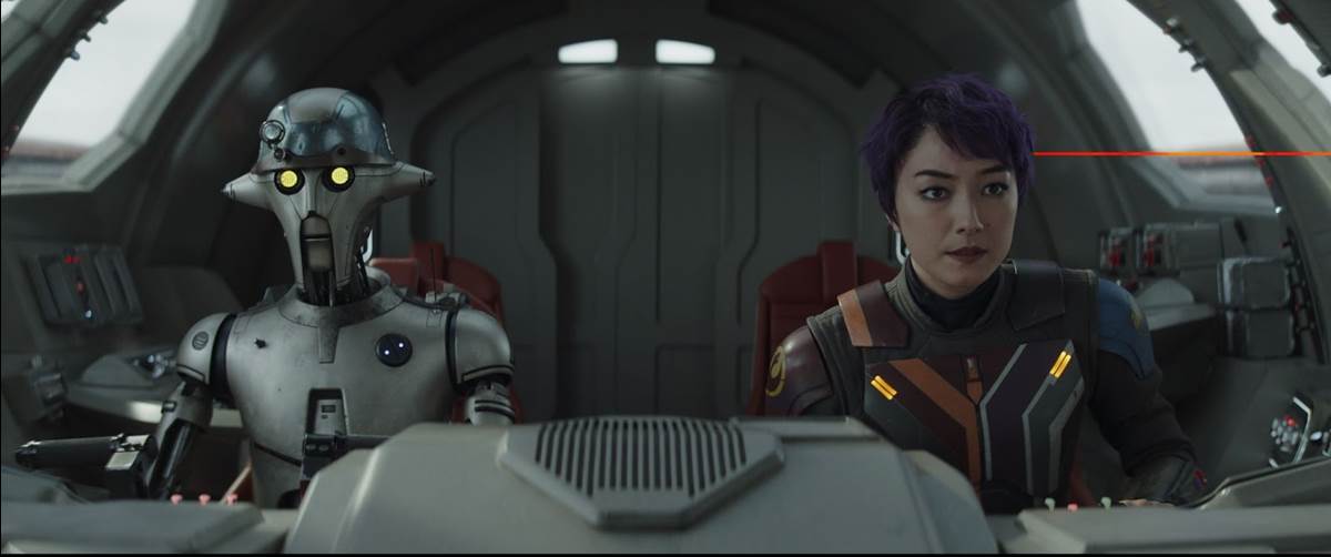 So Ahsoka and Sabine retreat back to Peridea’s surface, where they reunite with the Noti, and we get a very brief check-in with Baylan Skoll (Ray Stevenson) and Shin Hati (Ivanna Sakhno) as they continue their respective treks, with Baylan mounting a giant statue and following its gaze to a distant point on the horizon that’s blinking light, and Shin arriving at the raiders’ camp and flashing her red lightsaber blade. This is by far the most disappointing part of the episode for me, as now we know that Stevenson did not live to complete his role in the Star Wars saga. And a very intriguing role it was, which is another big part of the reason that hastily swept-under-the-rug element of the story feels so unsatisfying in this finale. I get that creator Dave Filoni must have been planning to follow through on Skoll’s quest in a future season of Ahsoka or other Star Wars media, but now the only two choices left are to reconfigure the narrative or (probably most sadly) recast the character.