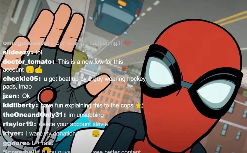 Spidey starts swinging through the city before becoming distracted by the scream of someone in need. We see some goons chasing a boy roughly Peter’s age. He falls into the street and is nearly hit by a truck before Spider-Man swings in to save him. The goons corner Spider-Man and the mystery boy in an alley before live-streaming their attack on them, an interesting decision. Spider-Man makes short work of them though and he webs them up before saying goodbye to their followers. A notable comment in their live stream chat comes from Screwball and it says “if you guys want to see better content, check out my channel!!!" Screwball is a low-level villain who also live streams all of her crimes, using Spider-Man as clickbait.
