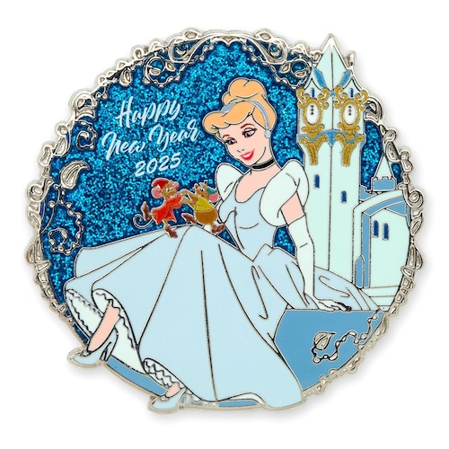 A special pin for New Year’s also features Cinderella, marking the occasion because, you know, midnight and all, with the clock tower and her mice friends, Jaq and Gus Gus.